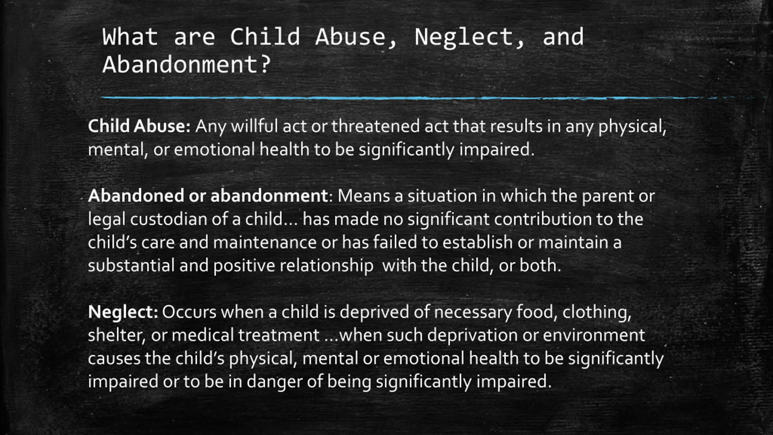 What are Child Abuse, Neglect, and Abandonment? Child Abuse: Any willful act or threatened act that results in any physical, mental, or emotional health to be significantly impaired. Abandoned or abandonment: Means a situation in which the parent or legal custodian of a child has made no significant contribution to the child s care and maintenance or has failed to establish or maintain a substantial and positive relationship with the child, or both. Neglect: Occurs when a child is deprived of necessary food, clothing, shelter, or medical treatment when such deprivation or environment causes the child s physical, mental or emotional health to be significantly impaired or to be in danger of being significantly impaired.