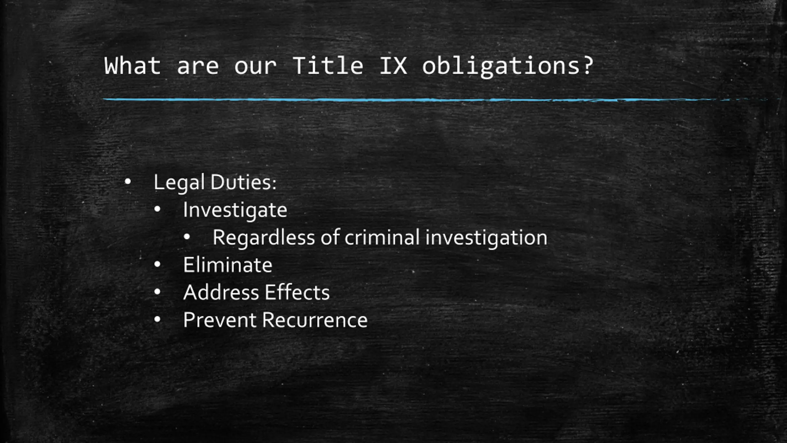 What are our Title IX obligations? Legal Duties: Investigate Regardless of criminal investigation Eliminate Address Effects Prevent Recurrence