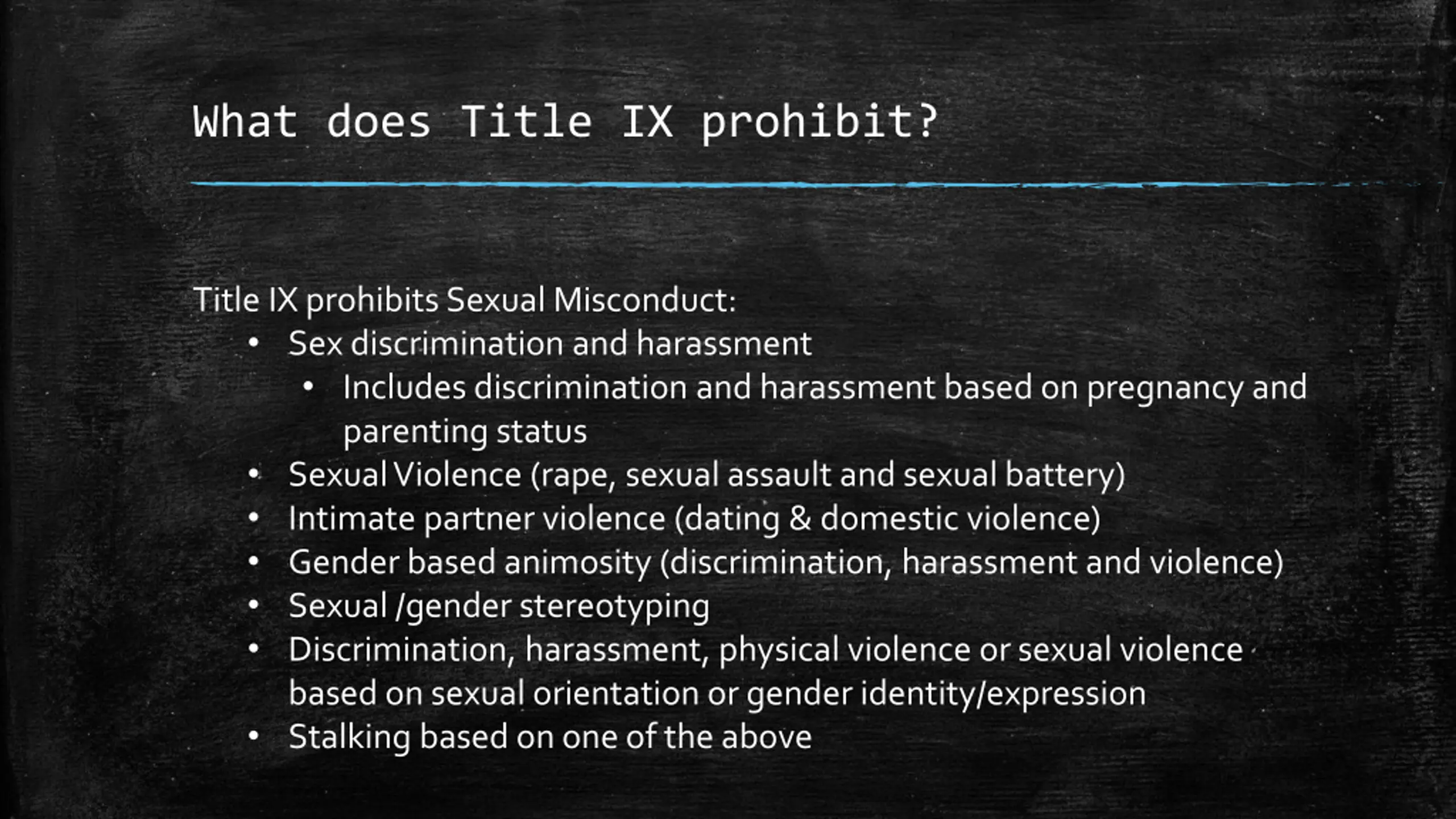 What does Title IX prohibit? Title IX prohibits Sexual Misconduct: Sex discrimination and harassment Includes discrimination and harassment based on pregnancy and parenting status Sexual Violence (rape, sexual assault and sexual battery) Intimate partner violence (dating & domestic violence) Gender based animosity (discrimination, harassment and violence) Sexual /gender stereotyping Discrimination, harassment, physical violence or sexual violence based on sexual orientation or gender identity/expression Stalking based on one of the above