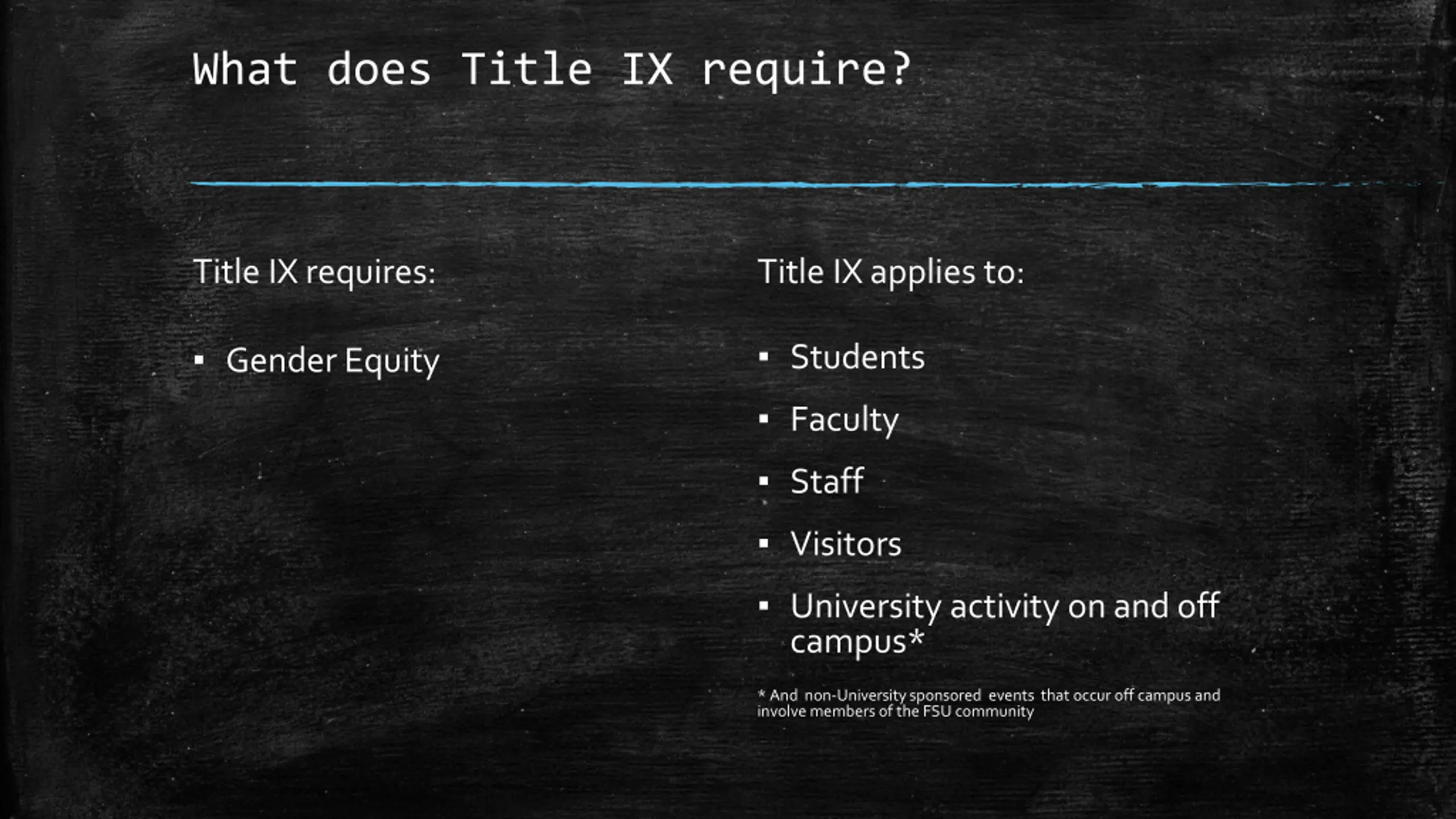 What does Title IX require? Title IX requires: Title IX applies to: Students Gender Equity Faculty Staff Visitors University activity on and off campus* * And non-University sponsored events that occur off campus and involve members of the FSU community