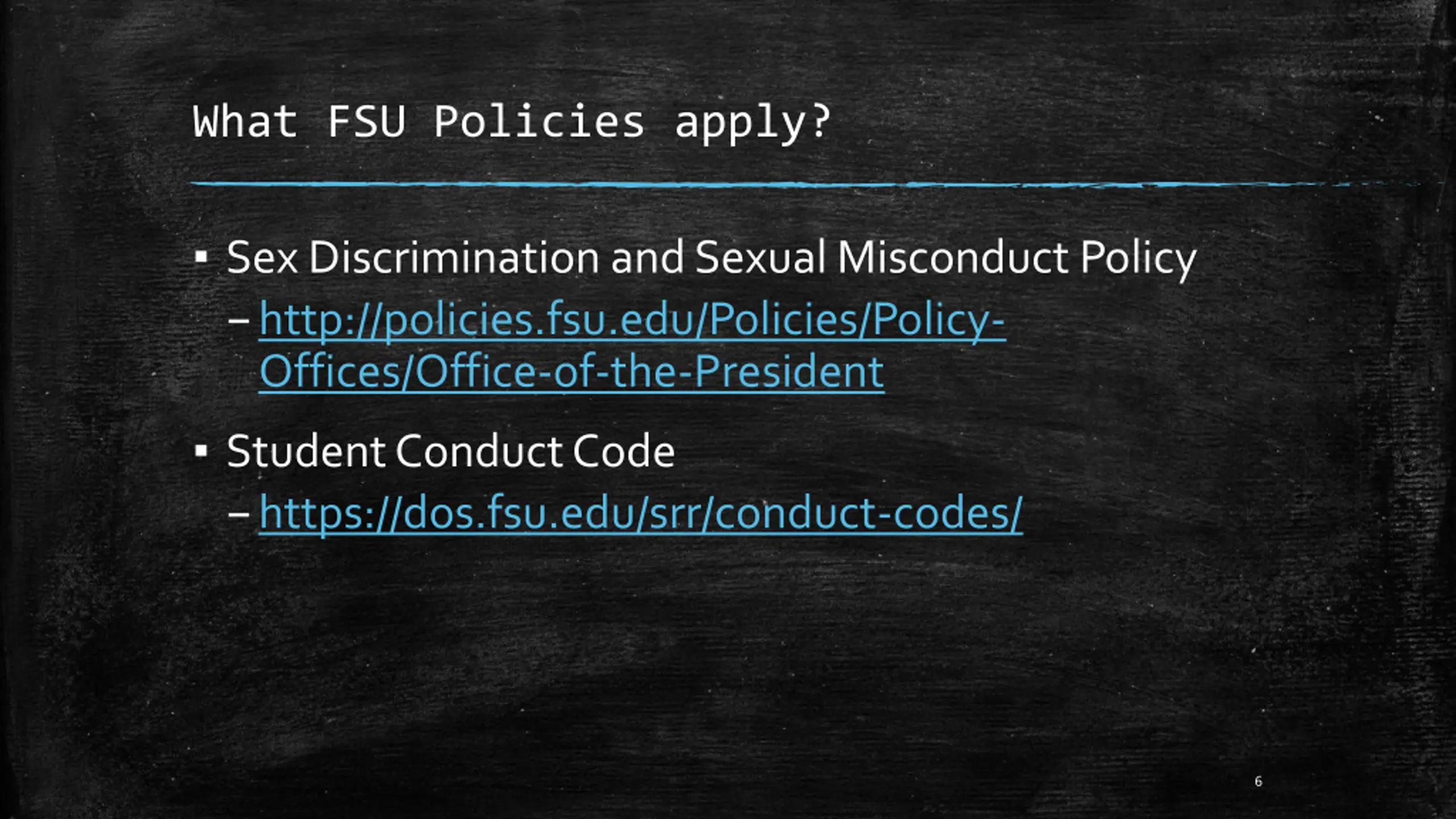 What FSU Policies apply? Sex Discrimination and Sexual Misconduct Policy http://policies.fsu.edu/Policies/Policy- Offices/Office-of-the-President Student Conduct Code https://dos.fsu.edu/srr/conduct-codes/ 6