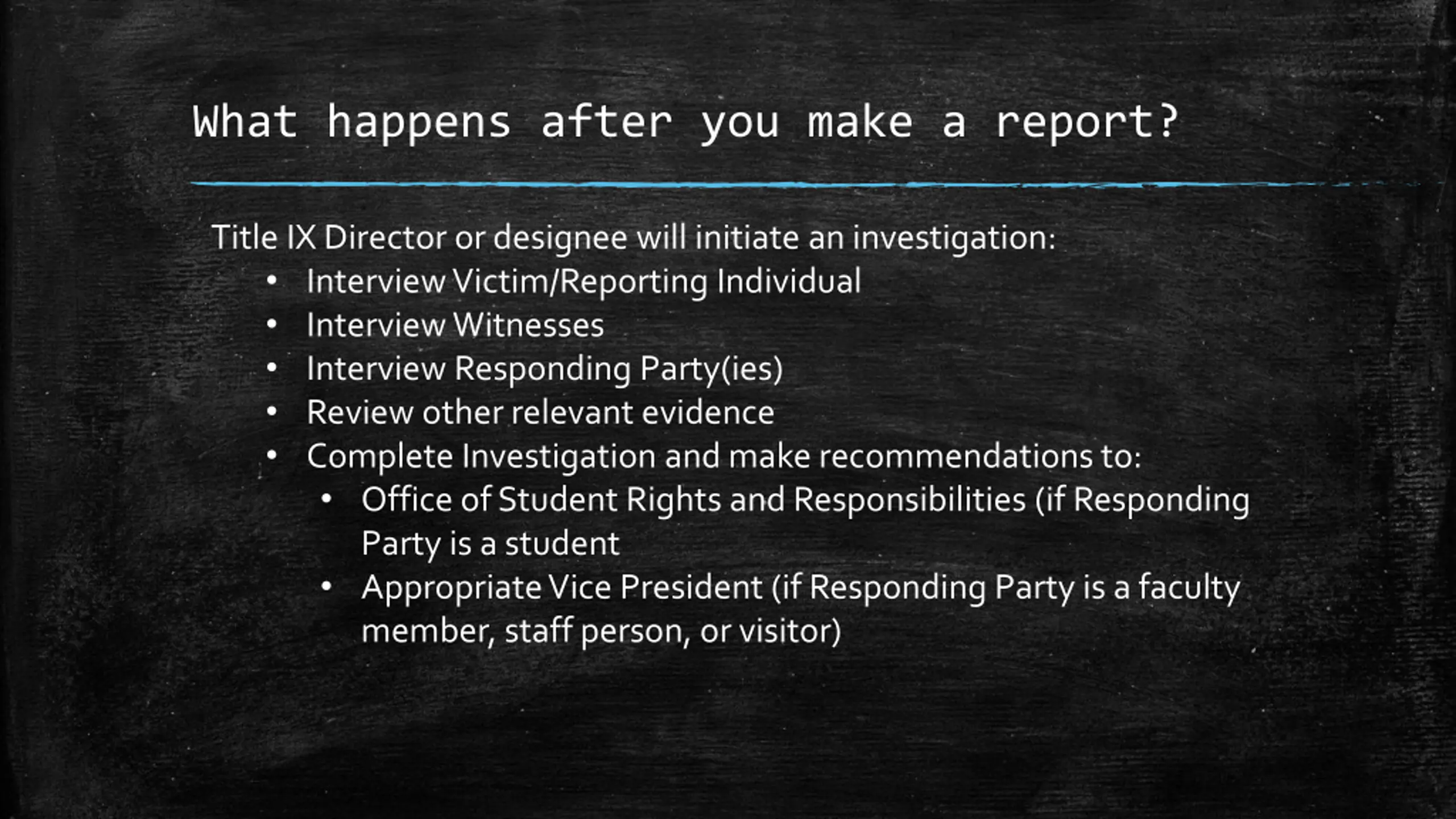 What happens after you make a report? Title IX Director or designee will initiate an investigation: Interview Victim/Reporting Individual Interview Witnesses Interview Responding Party(ies) Review other relevant evidence Complete Investigation and make recommendations to: Office of Student Rights and Responsibilities (if Responding Party is a student Appropriate Vice President (if Responding Party is a faculty member, staff person, or visitor)