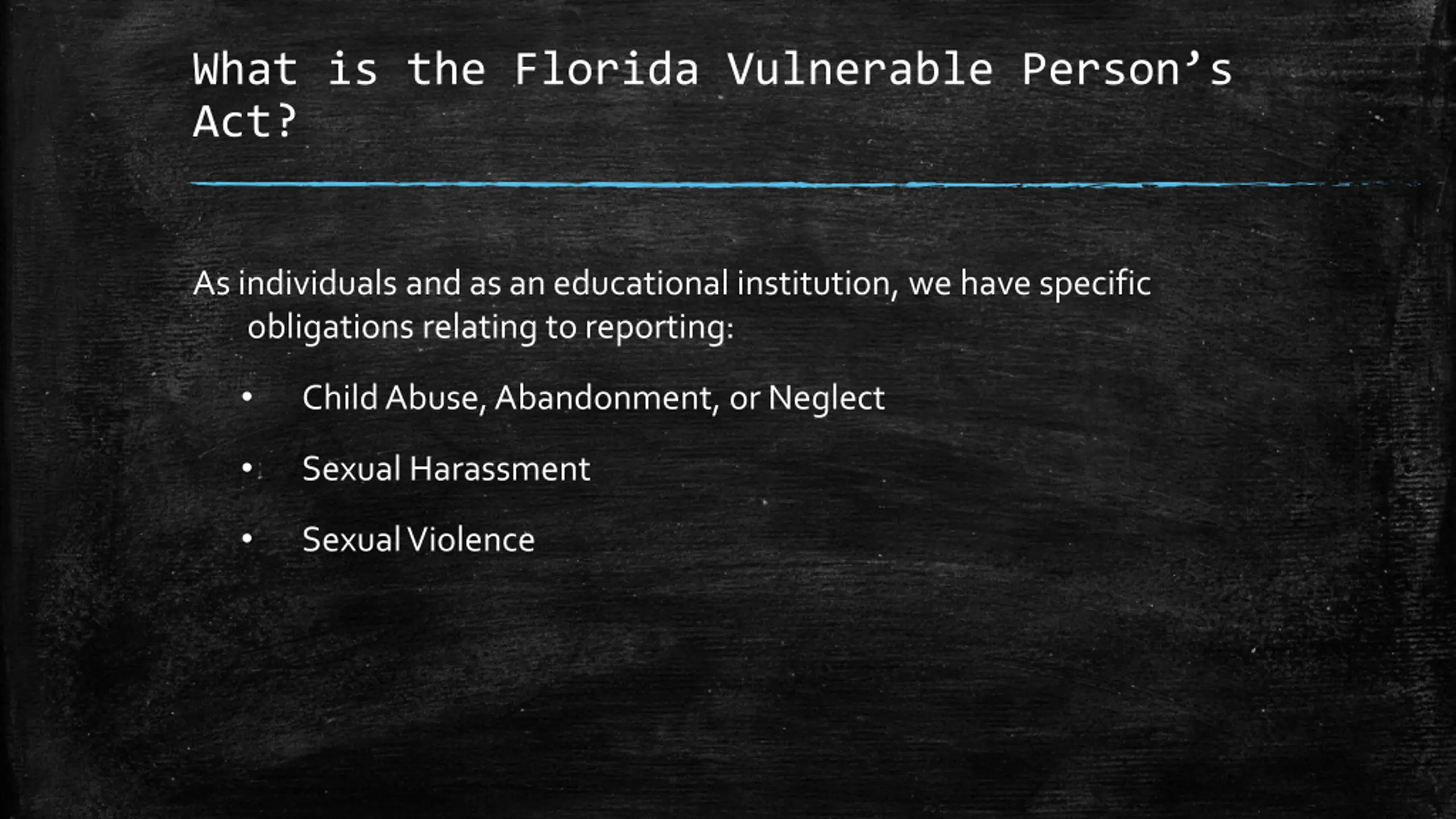 What is the Florida Vulnerable Persons Act? As individuals and as an educational institution, we have specific obligations relating to reporting: Child Abuse, Abandonment, or Neglect Sexual Harassment Sexual Violence