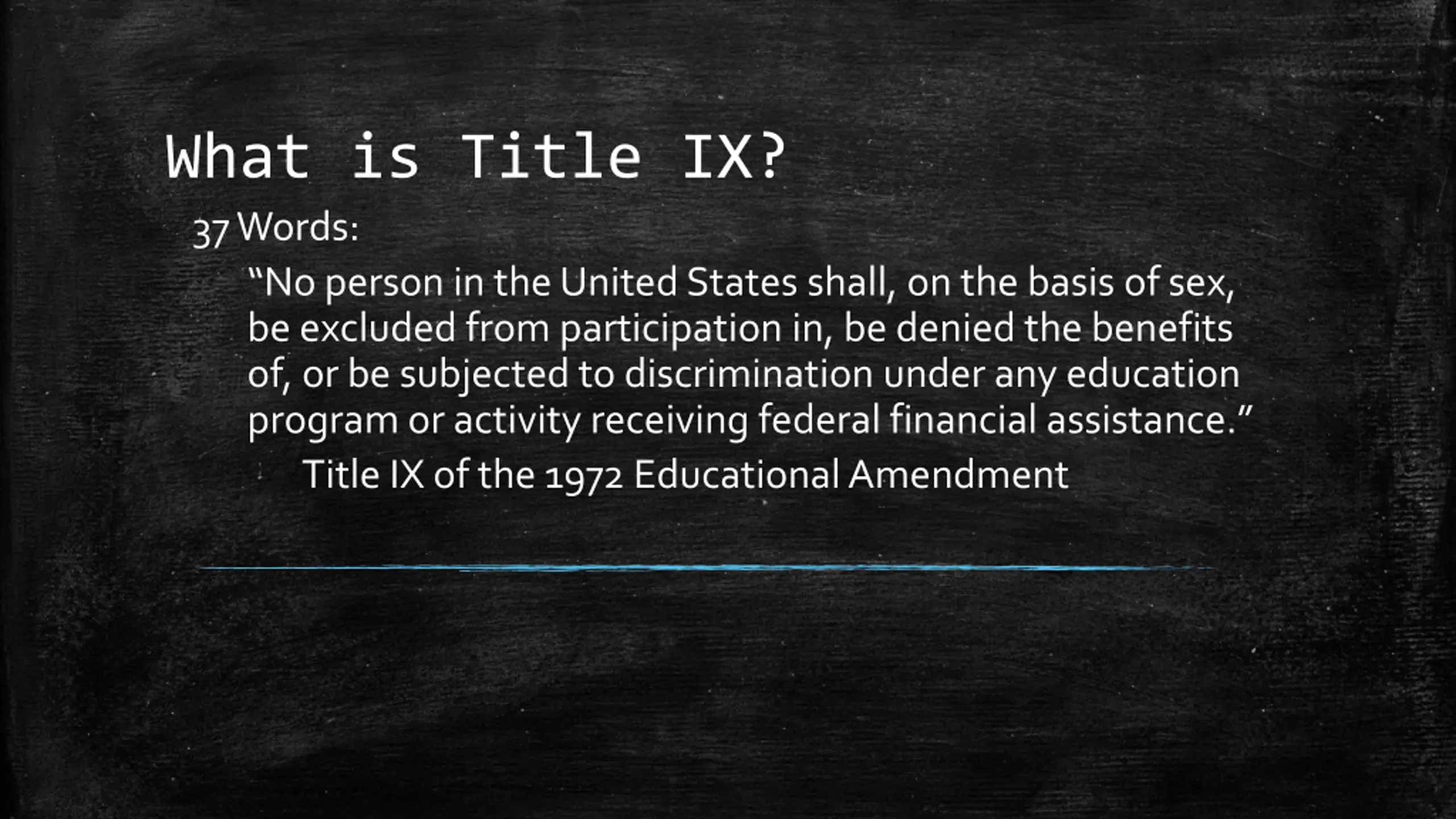 What is Title IX? 37 Words: No person in the United States shall, on the basis of sex, be excluded from participation in, be denied the benefits of, or be subjected to discrimination under any education program or activity receiving federal financial assistance. Title IX of the 1972 Educational Amendment