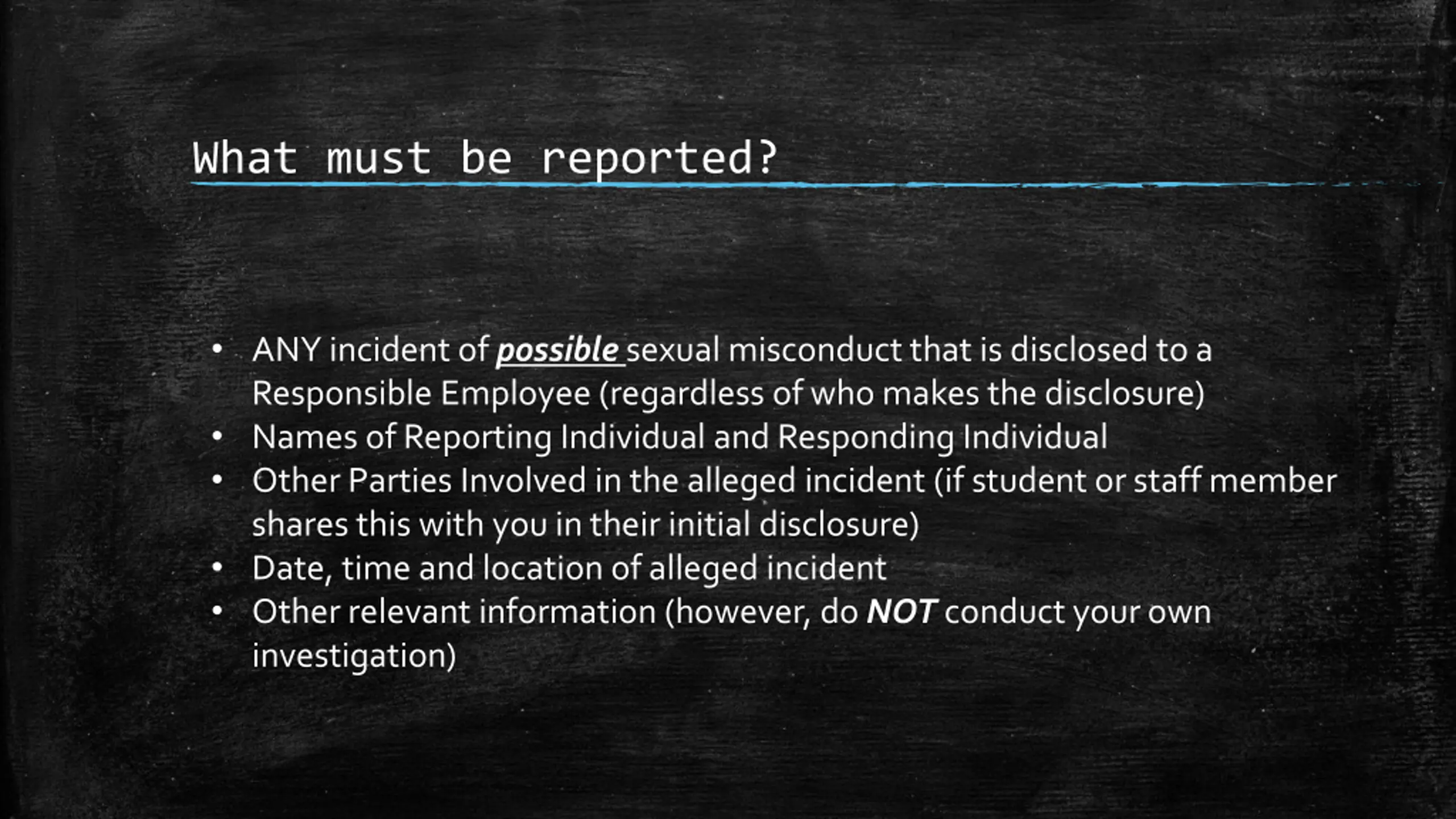 What must be reported? ANY incident of possible sexual misconduct that is disclosed to a Responsible Employee (regardless of who makes the disclosure) Names of Reporting Individual and Responding Individual Other Parties Involved in the alleged incident (if student or staff member shares this with you in their initial disclosure) Date, time and location of alleged incident Other relevant information (however, do NOT conduct your own investigation)