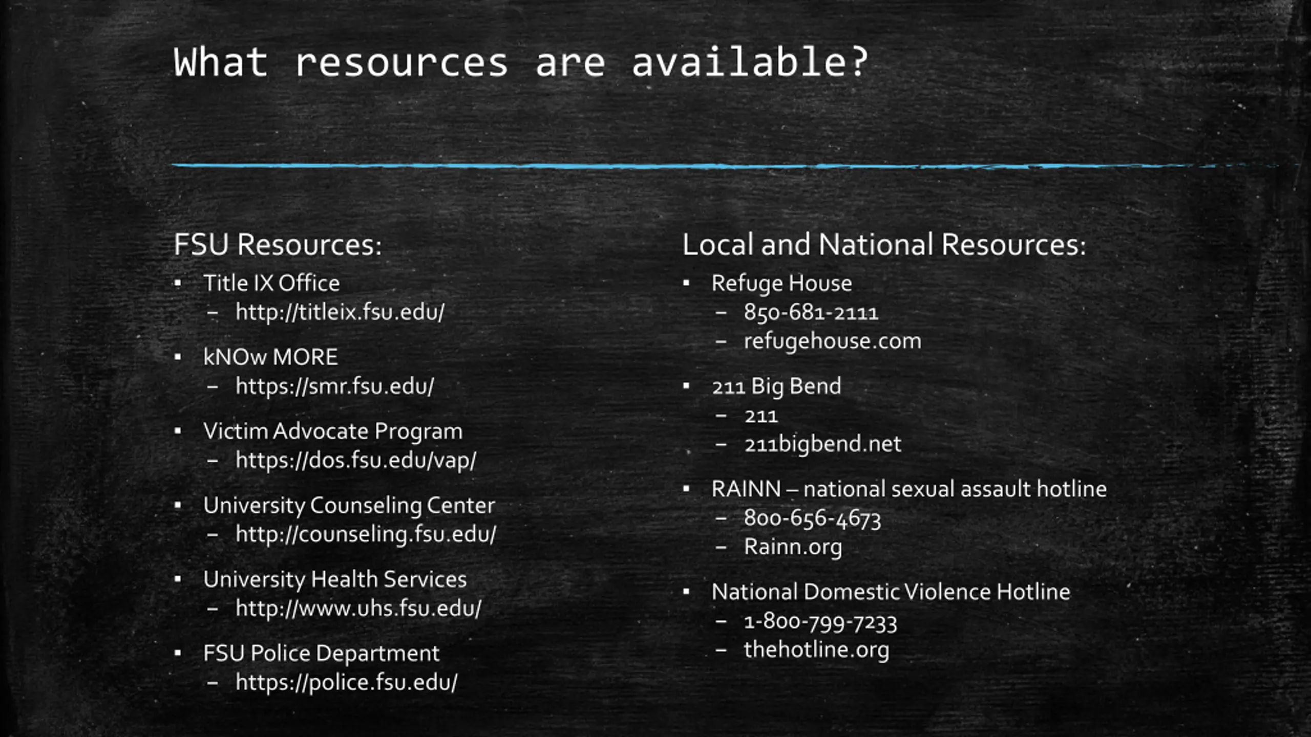 What resources are available? FSU Resources: Title IX Office http://titleix.fsu.edu/ Local and National Resources: Refuge House 850-681-2111 refugehouse.com kNOw MORE https://smr.fsu.edu/ 211 Big Bend 211 211bigbend.net Victim Advocate Program https://dos.fsu.edu/vap/ RAINN national sexual assault hotline 800-656-4673 Rainn.org University Counseling Center http://counseling.fsu.edu/ University Health Services http://www.uhs.fsu.edu/ National Domestic Violence Hotline 1-800-799-7233 thehotline.org FSU Police Department https://police.fsu.edu/
