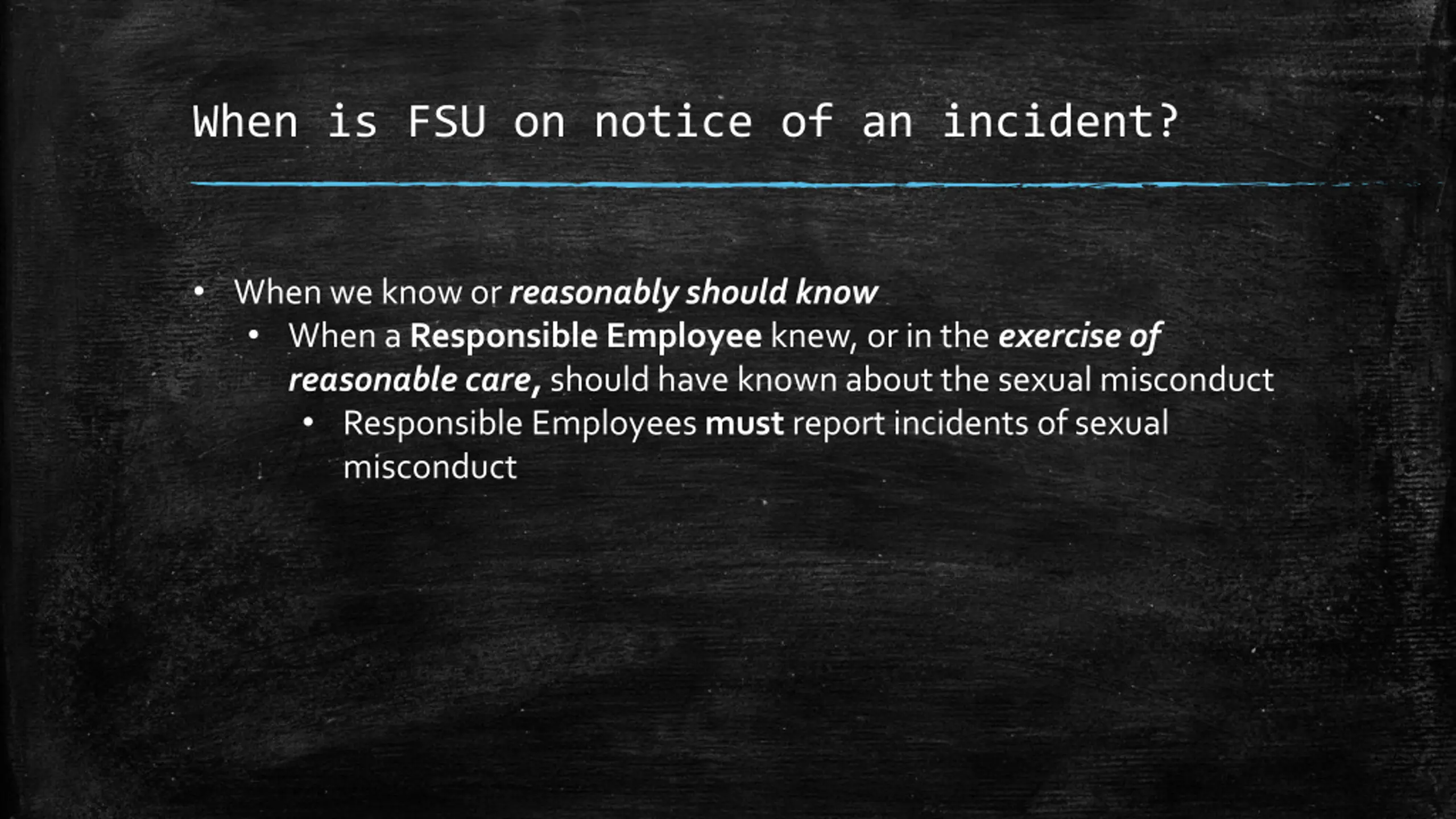 When is FSU on notice of an incident? When we know or reasonably should know When a Responsible Employee knew, or in the exercise of reasonable care, should have known about the sexual misconduct Responsible Employees must report incidents of sexual misconduct