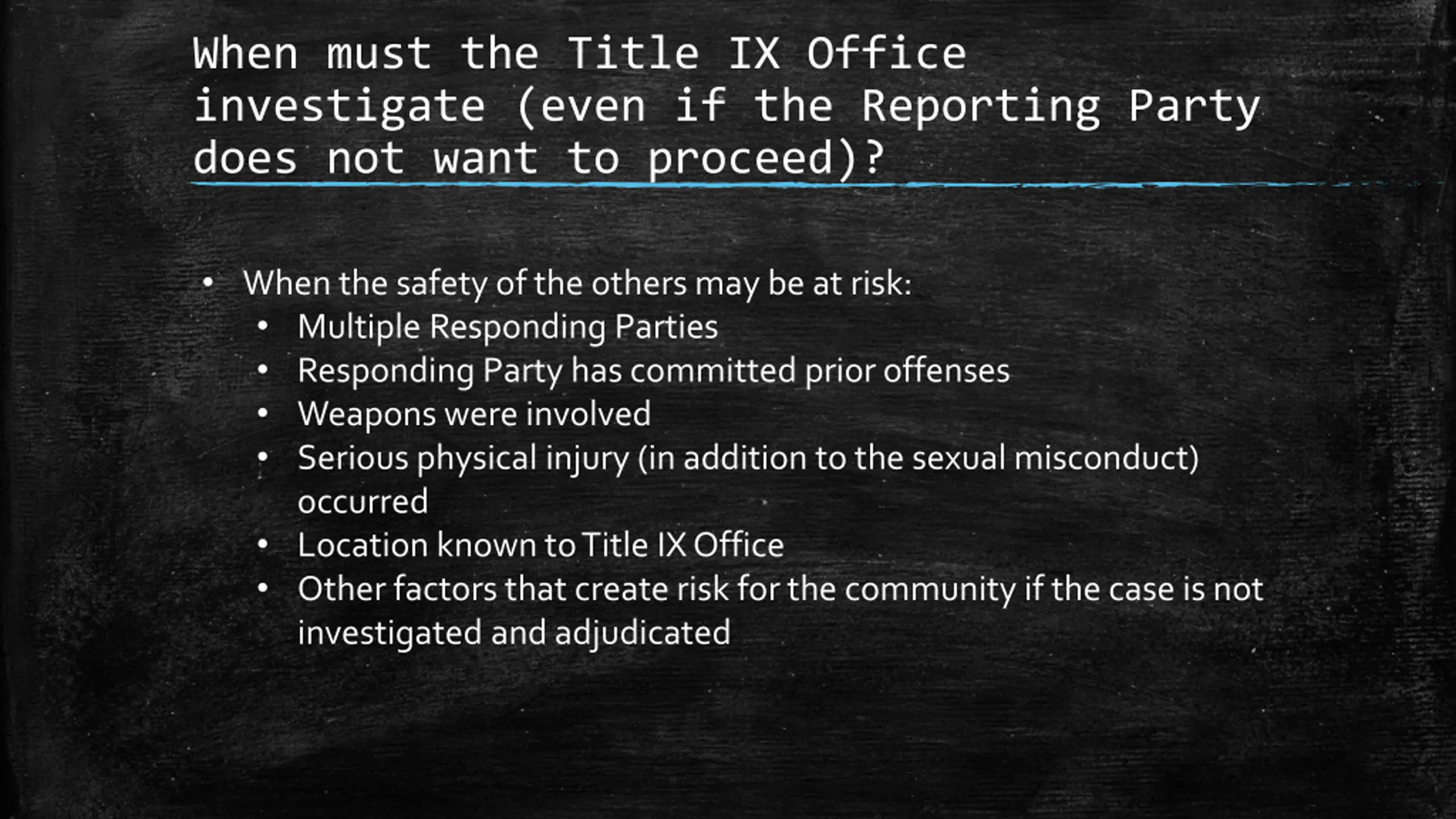 When must the Title IX Office investigate (even if the Reporting Party does not want to proceed)? When the safety of the others may be at risk: Multiple Responding Parties Responding Party has committed prior offenses Weapons were involved Serious physical injury (in addition to the sexual misconduct) occurred Location known to Title IX Office Other factors that create risk for the community if the case is not investigated and adjudicated