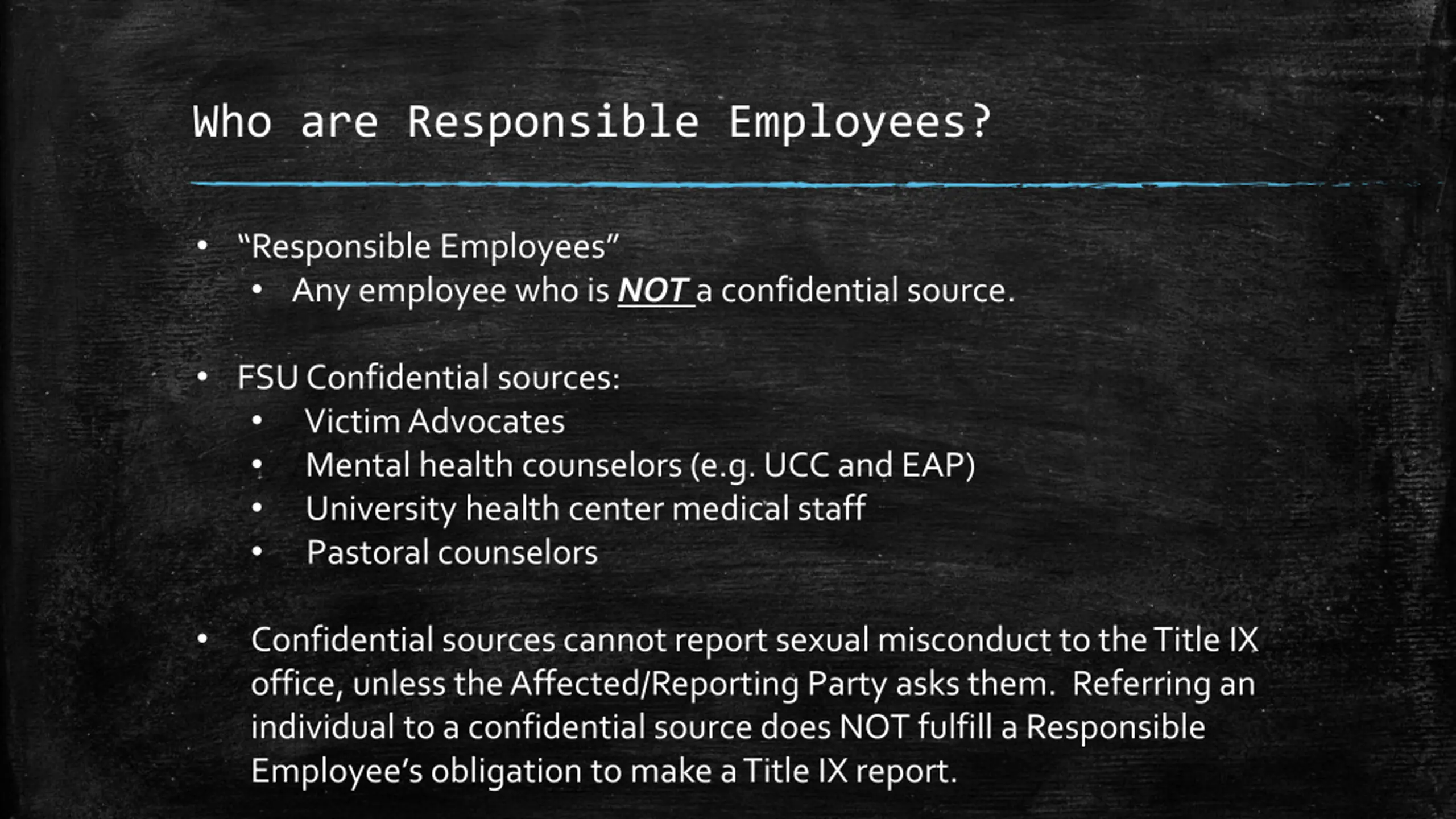 Who are Responsible Employees? Responsible Employees Any employee who is NOT a confidential source. FSU Confidential sources: Victim Advocates Mental health counselors (e.g. UCC and EAP) University health center medical staff Pastoral counselors Confidential sources cannot report sexual misconduct to the Title IX office, unless the Affected/Reporting Party asks them. Referring an individual to a confidential source does NOT fulfill a Responsible Employee s obligation to make a Title IX report.