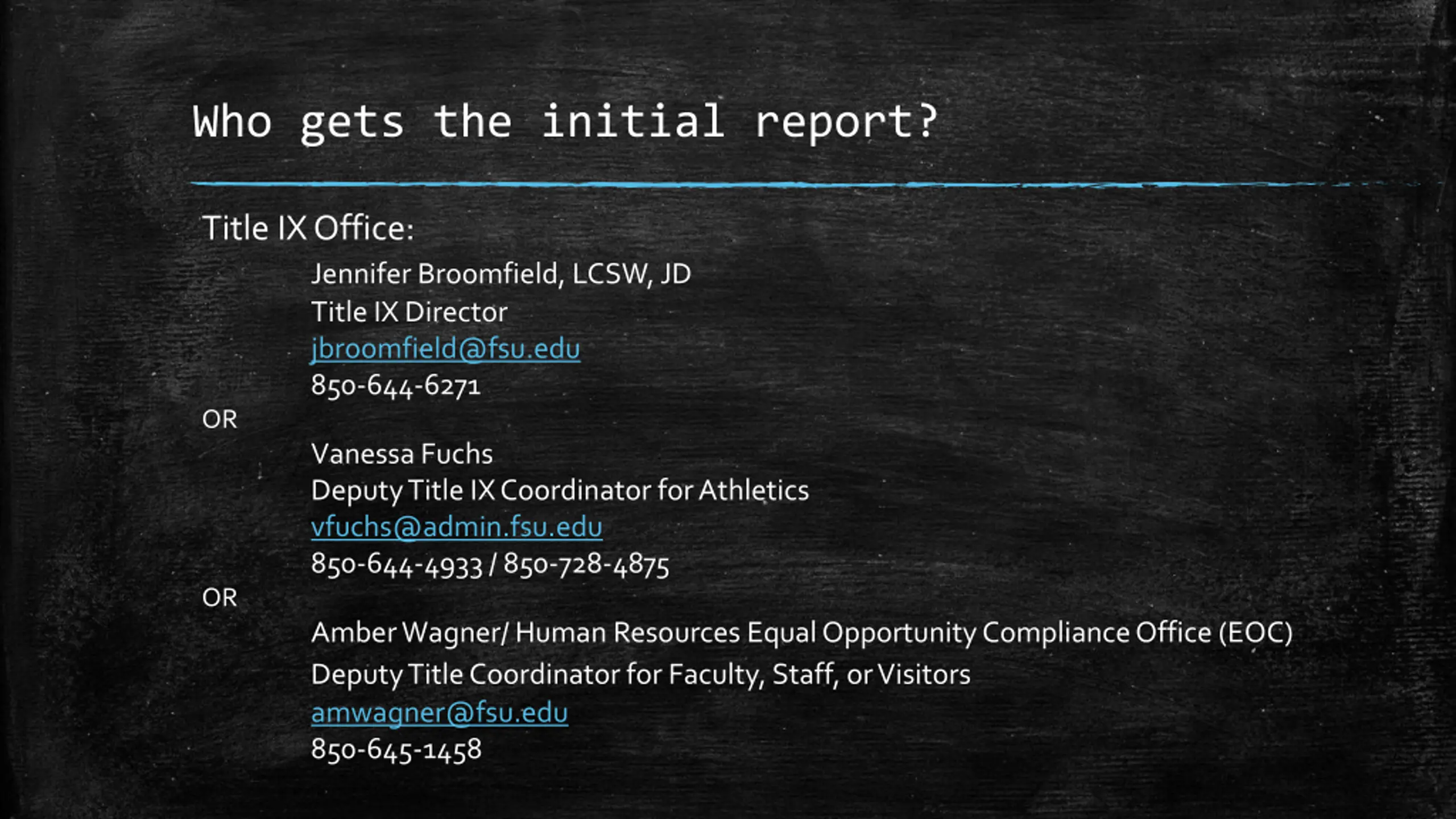 Who gets the initial report? Title IX Office: OR OR Jennifer Broomfield, LCSW, JD Title IX Director jbroomfield@fsu.edu 850-644-6271 Vanessa Fuchs Deputy Title IX Coordinator for Athletics vfuchs@admin.fsu.edu 850-644-4933 / 850-728-4875 Amber Wagner/ Human Resources Equal Opportunity Compliance Office (EOC) Deputy Title Coordinator for Faculty, Staff, or Visitors amwagner@fsu.edu 850-645-1458