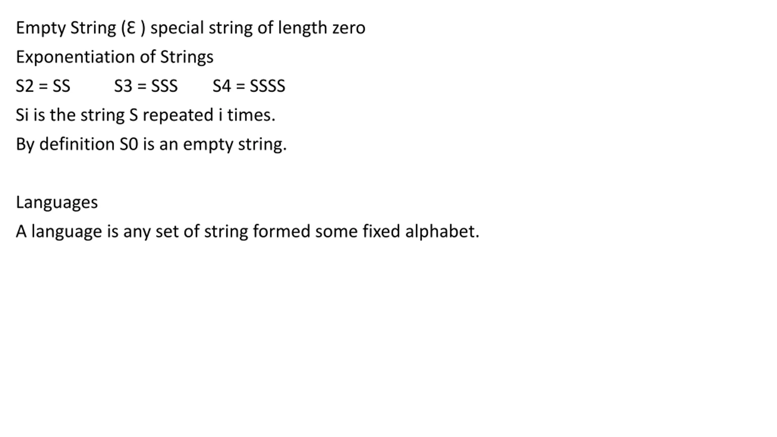 Empty String ( ) special string of length zero Exponentiation of Strings S2 = SS S3 = SSS S4 = SSSS Si is the string S repeated i times. By definition S0 is an empty string. Languages A language is any set of string formed some fixed alphabet.
