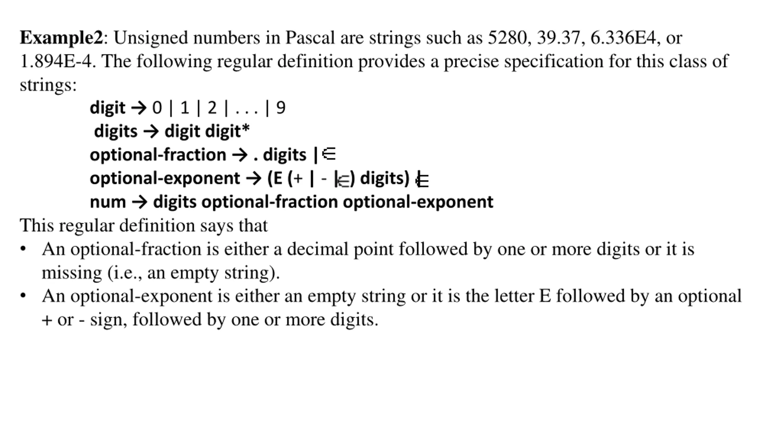 Example2: Unsigned numbers in Pascal are strings such as 5280, 39.37, 6.336E4, or 1.894E-4. The following regular definition provides a precise specification for this class of strings: digit 0 | 1 | 2 | . . . | 9 digits digit digit* optional-fraction . digits | optional-exponent (E (+ | - | ) digits) | num digits optional-fraction optional-exponent This regular definition says that An optional-fraction is either a decimal point followed by one or more digits or it is missing (i.e., an empty string). An optional-exponent is either an empty string or it is the letter E followed by an optional + or - sign, followed by one or more digits.