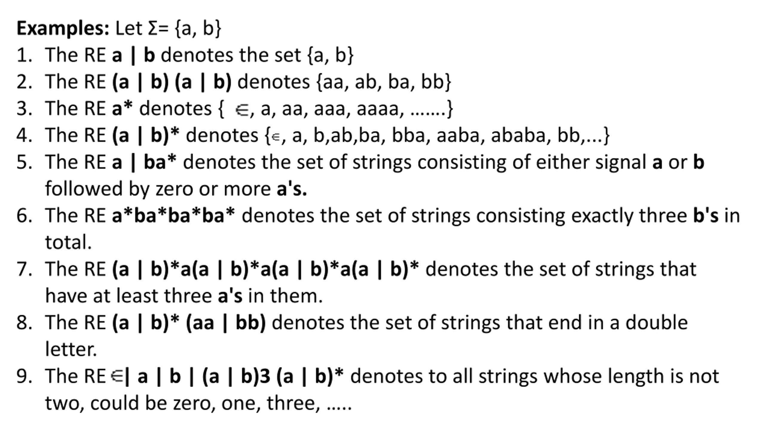 Examples: Let = {a, b} 1. The RE a | b denotes the set {a, b} 2. The RE (a | b) (a | b) denotes {aa, ab, ba, bb} 3. The RE a* denotes { , a, aa, aaa, aaaa, .} 4. The RE (a | b)* denotes { , a, b,ab,ba, bba, aaba, ababa, bb,...} 5. The RE a | ba* denotes the set of strings consisting of either signal a or b followed by zero or more a's. 6. The RE a*ba*ba*ba* denotes the set of strings consisting exactly three b's in total. 7. The RE (a | b)*a(a | b)*a(a | b)*a(a | b)* denotes the set of strings that have at least three a's in them. 8. The RE (a | b)* (aa | bb) denotes the set of strings that end in a double letter. 9. The RE | a | b | (a | b)3 (a | b)* denotes to all strings whose length is not two, could be zero, one, three, ..