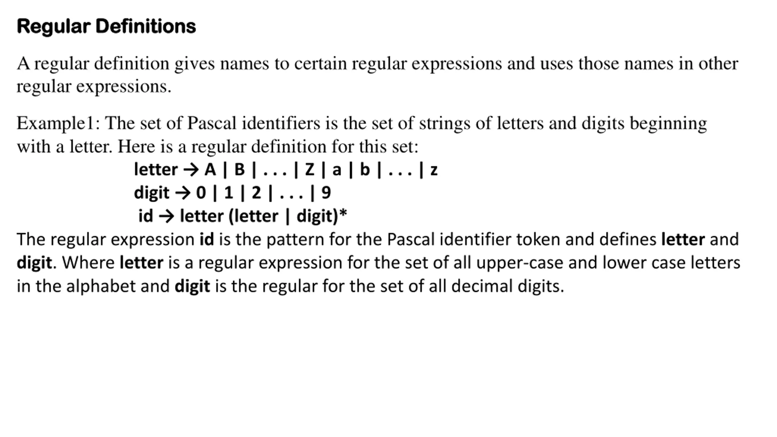 Regular Definitions Regular Definitions A regular definition gives names to certain regular expressions and uses those names in other regular expressions. Example1: The set of Pascal identifiers is the set of strings of letters and digits beginning with a letter. Here is a regular definition for this set: letter A | B | . . . | Z | a | b | . . . | z digit 0 | 1 | 2 | . . . | 9 id letter (letter | digit)* The regular expression id is the pattern for the Pascal identifier token and defines letter and digit. Where letter is a regular expression for the set of all upper-case and lower case letters in the alphabet and digit is the regular for the set of all decimal digits.