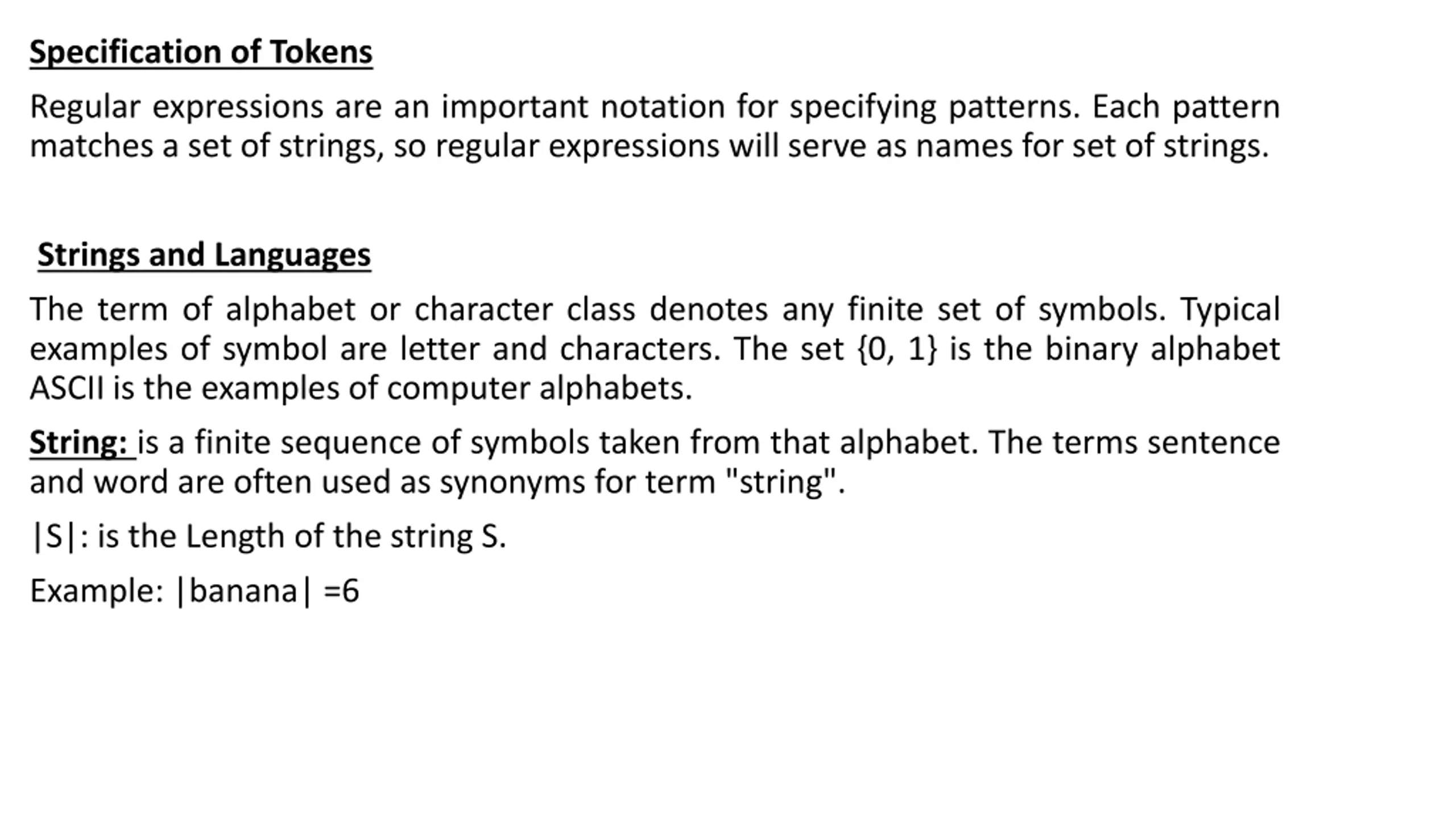 Specification of Tokens Regular expressions are an important notation for specifying patterns. Each pattern matches a set of strings, so regular expressions will serve as names for set of strings. Strings and Languages The term of alphabet or character class denotes any finite set of symbols. Typical examples of symbol are letter and characters. The set {0, 1} is the binary alphabet ASCII is the examples of computer alphabets. String: is a finite sequence of symbols taken from that alphabet. The terms sentence and word are often used as synonyms for term "string". |S|: is the Length of the string S. Example: |banana| =6
