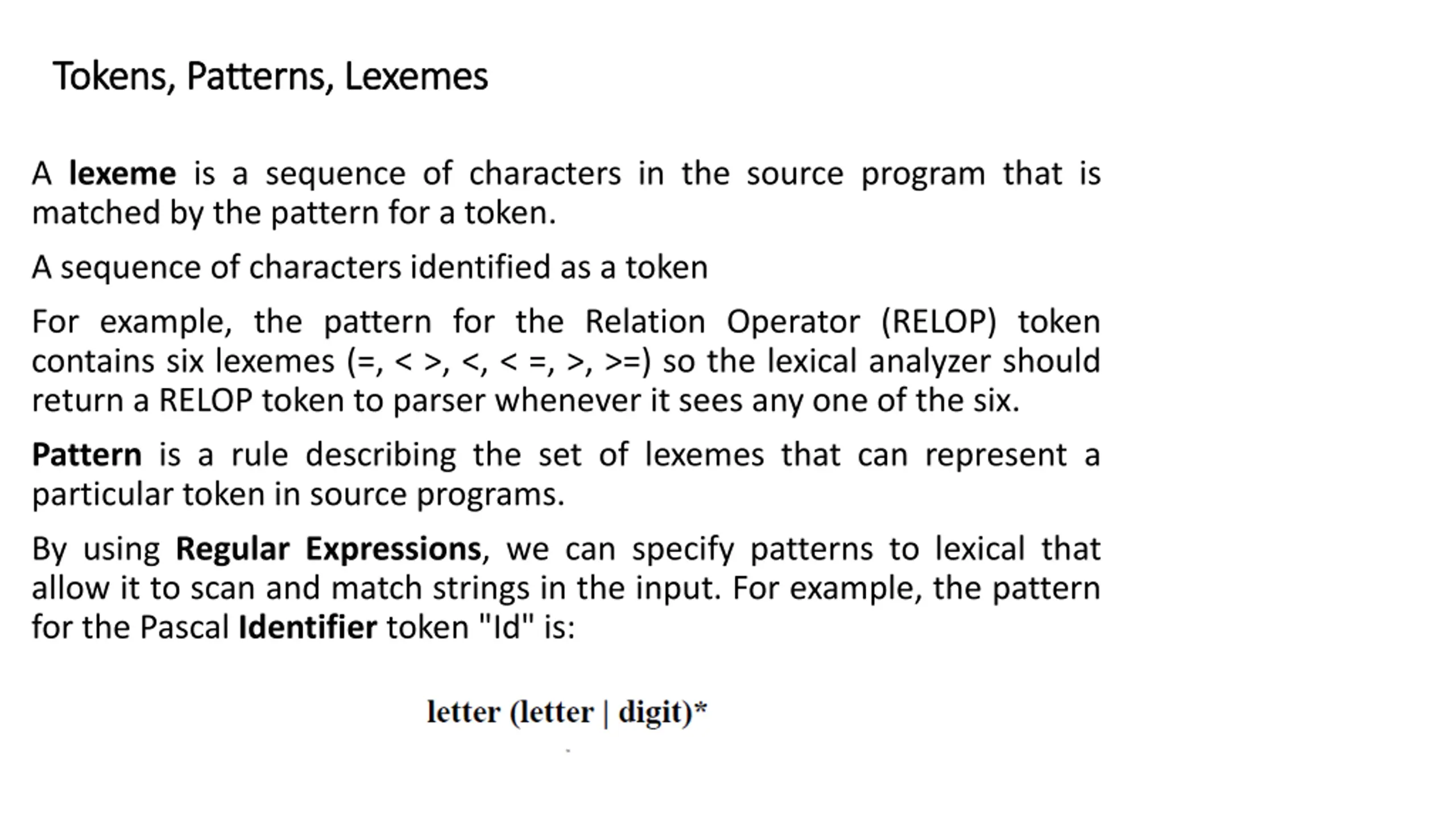 Tokens, Patterns, Lexemes Tokens, Patterns, Lexemes A lexeme is a sequence of characters in the source program that is matched by the pattern for a token. A sequence of characters identified as a token For example, the pattern for the Relation Operator (RELOP) token contains six lexemes (=, < >, <, < =, >, >=) so the lexical analyzer should return a RELOP token to parser whenever it sees any one of the six. Pattern is a rule describing the set of lexemes that can represent a particular token in source programs. By using Regular Expressions, we can specify patterns to lexical that allow it to scan and match strings in the input. For example, the pattern for the Pascal Identifier token "Id" is: