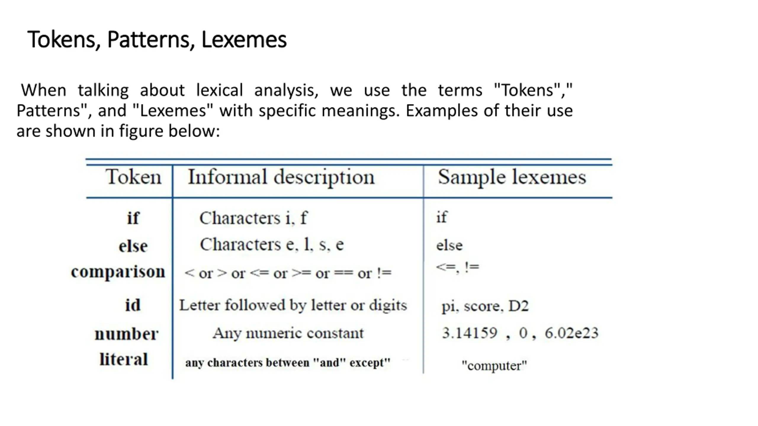 Tokens, Patterns, Lexemes Tokens, Patterns, Lexemes When talking about lexical analysis, we use the terms "Tokens"," Patterns", and "Lexemes" with specific meanings. Examples of their use are shown in figure below: