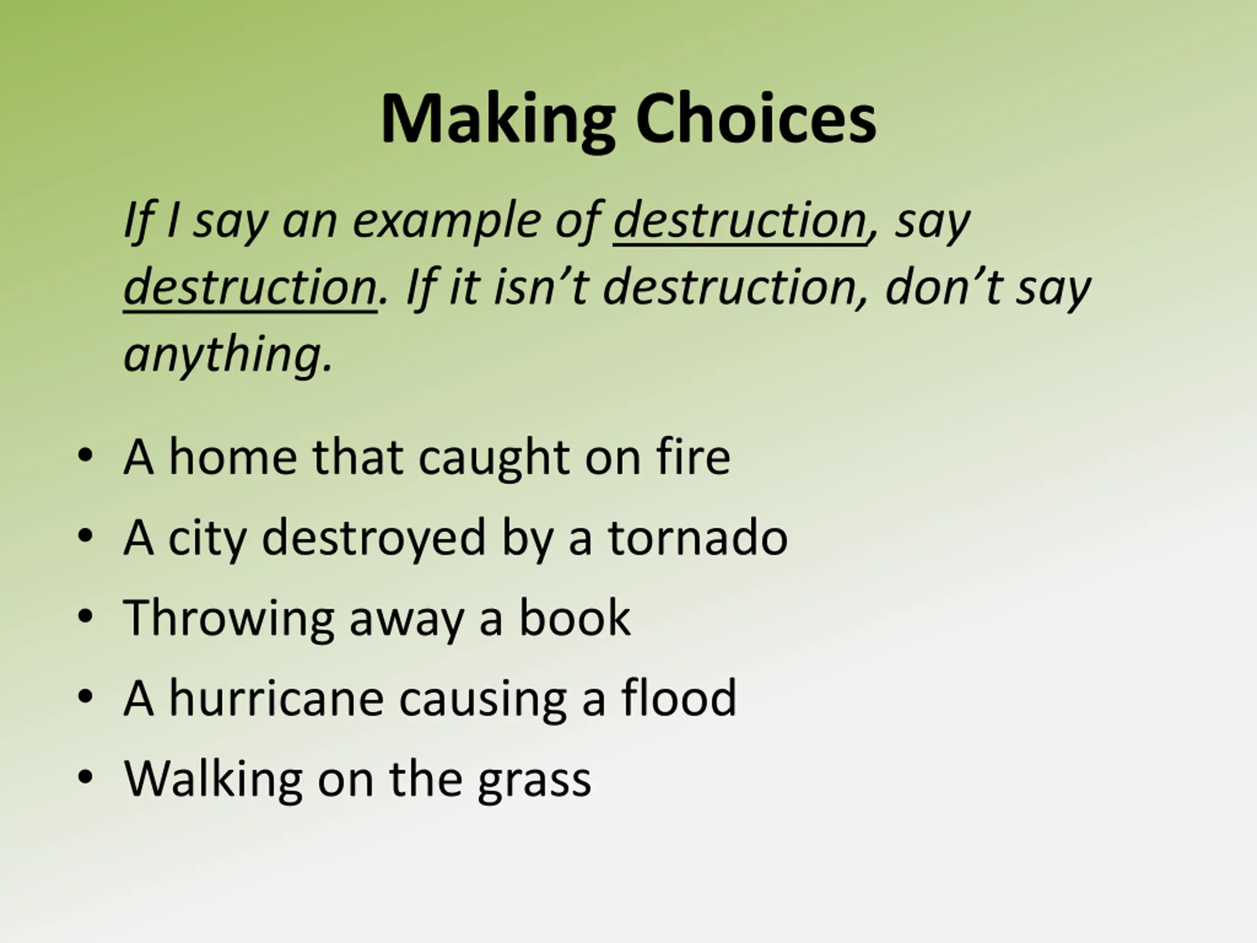 Making Choices If I say an example of destruction, say destruction. If it isn t destruction, don t say anything. A home that caught on fire A city destroyed by a tornado Throwing away a book A hurricane causing a flood Walking on the grass