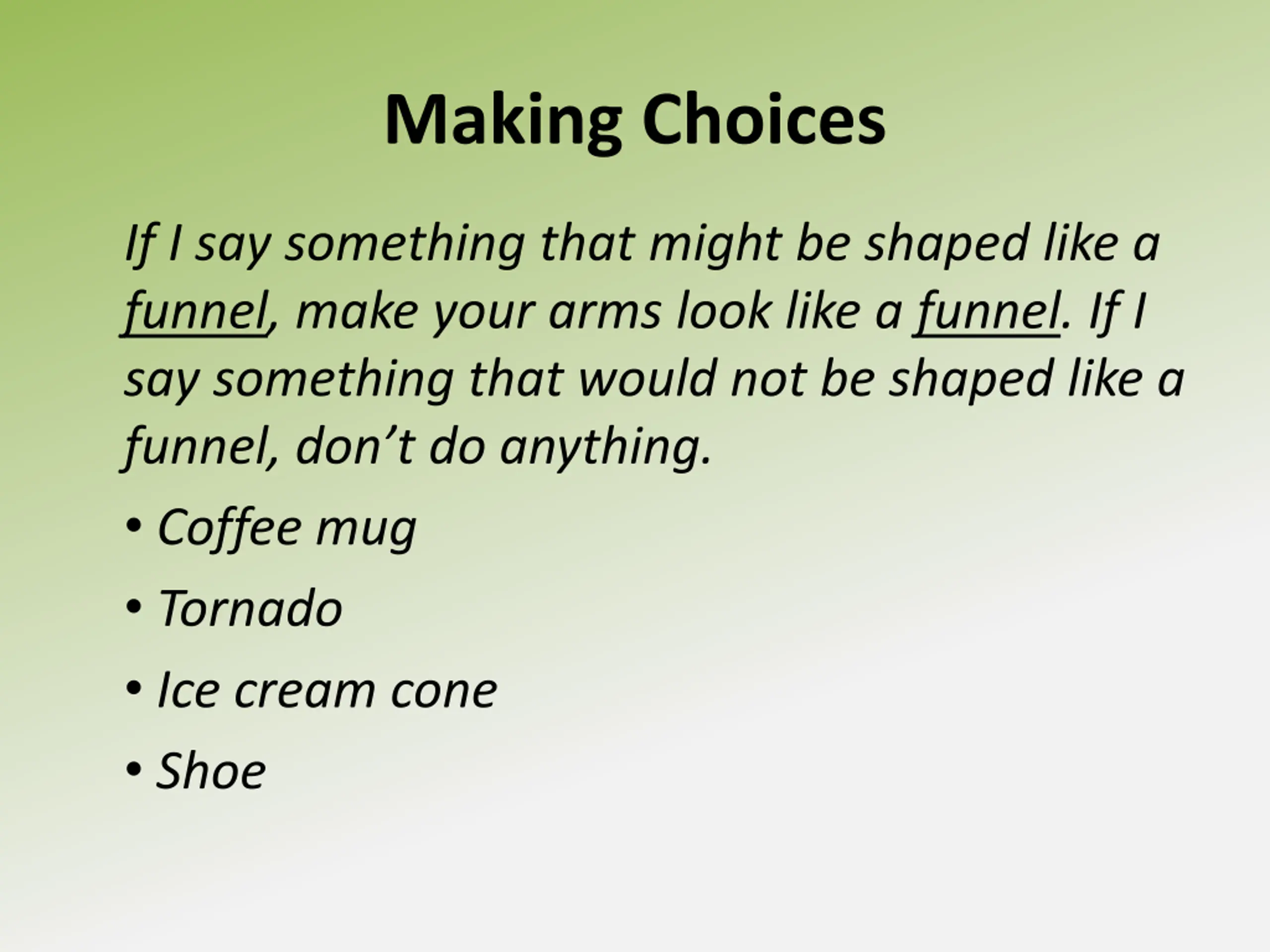 Making Choices If I say something that might be shaped like a funnel, make your arms look like a funnel. If I say something that would not be shaped like a funnel, don t do anything. Coffee mug Tornado Ice cream cone Shoe