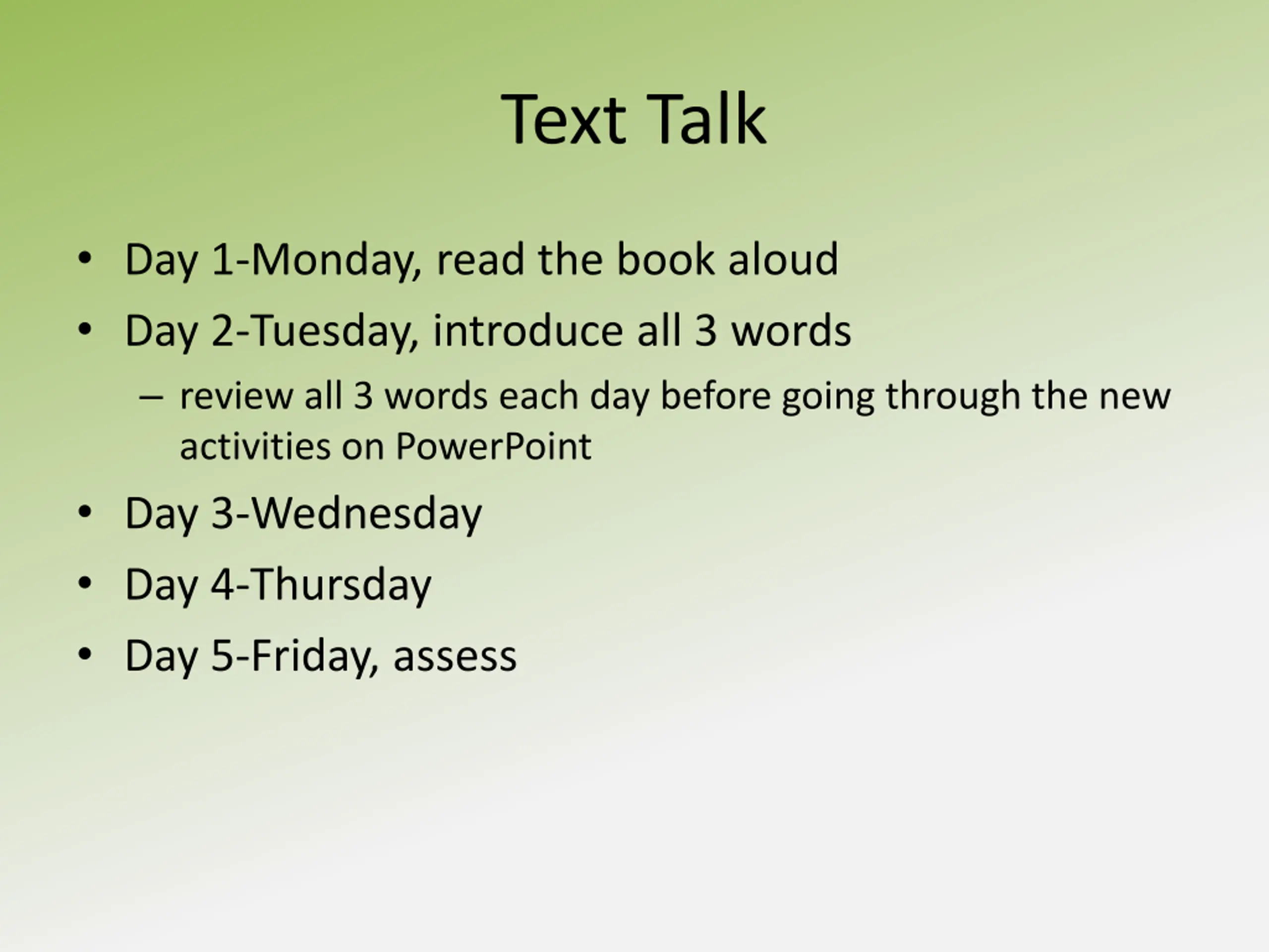 Text Talk Day 1-Monday, read the book aloud Day 2-Tuesday, introduce all 3 words review all 3 words each day before going through the new activities on PowerPoint Day 3-Wednesday Day 4-Thursday Day 5-Friday, assess
