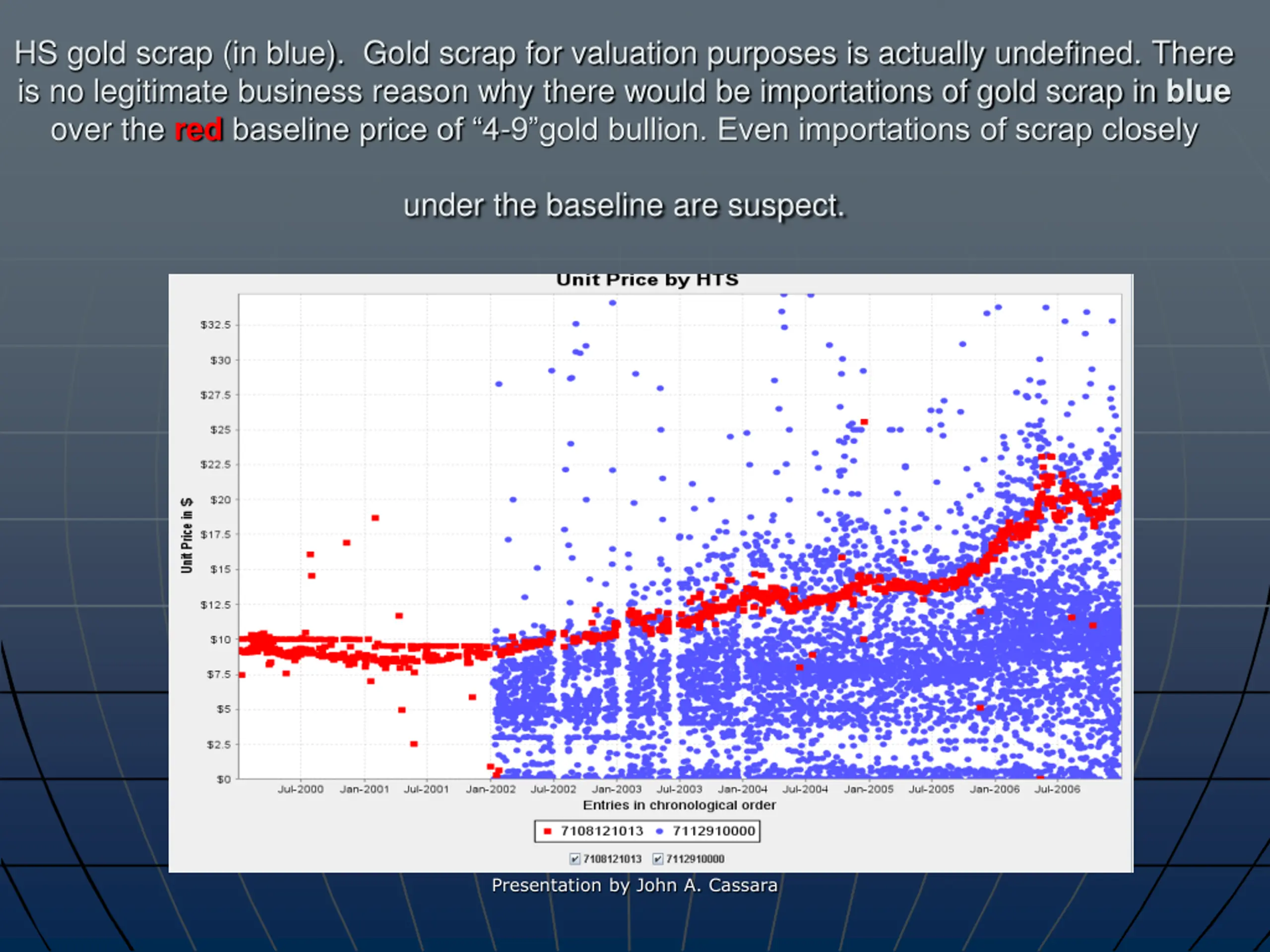 HS gold scrap (in blue). Gold scrap for valuation purposes is actually undefined. There is no legitimate business reason why there would be importations of gold scrap in blue over the red baseline price of 4-9 gold bullion. Even importations of scrap closely under the baseline are suspect. Presentation by John A. Cassara