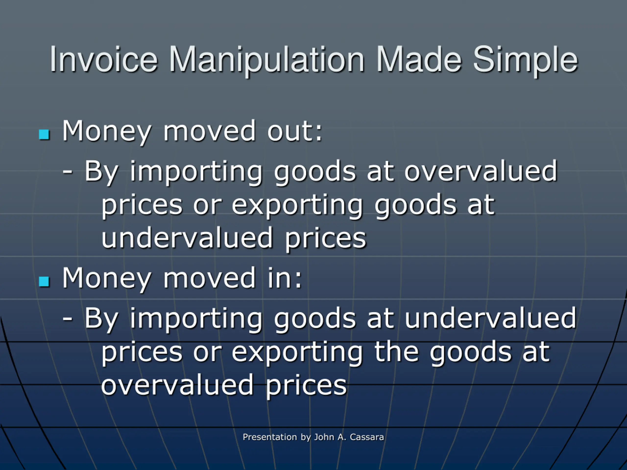 Invoice Manipulation Made Simple Money moved out: - By importing goods at overvalued prices or exporting goods at undervalued prices Money moved in: - By importing goods at undervalued prices or exporting the goods at overvalued prices Presentation by John A. Cassara