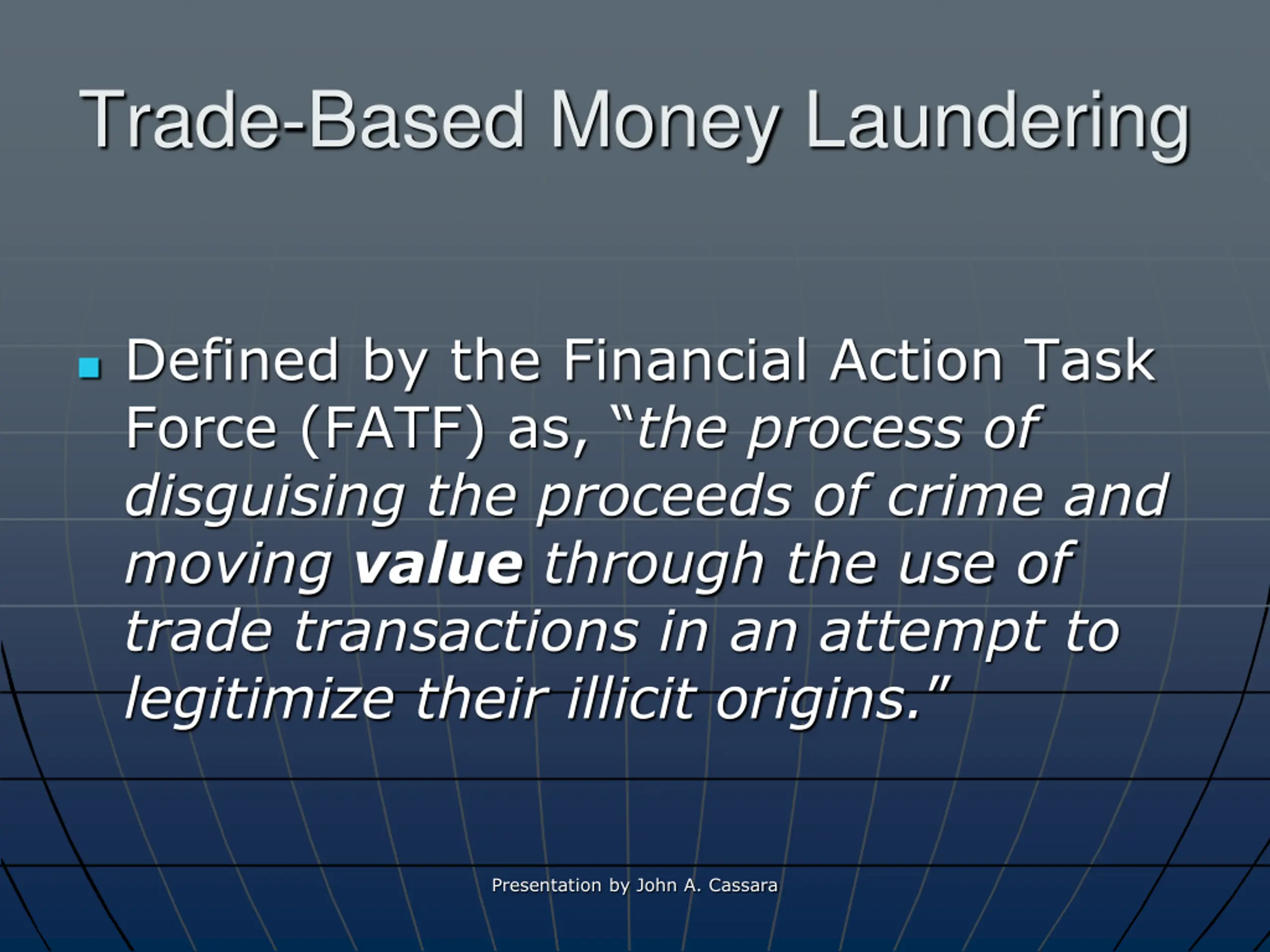 Trade-Based Money Laundering Defined by the Financial Action Task Force (FATF) as, the process of disguising the proceeds of crime and moving value through the use of trade transactions in an attempt to legitimize their illicit origins. Presentation by John A. Cassara