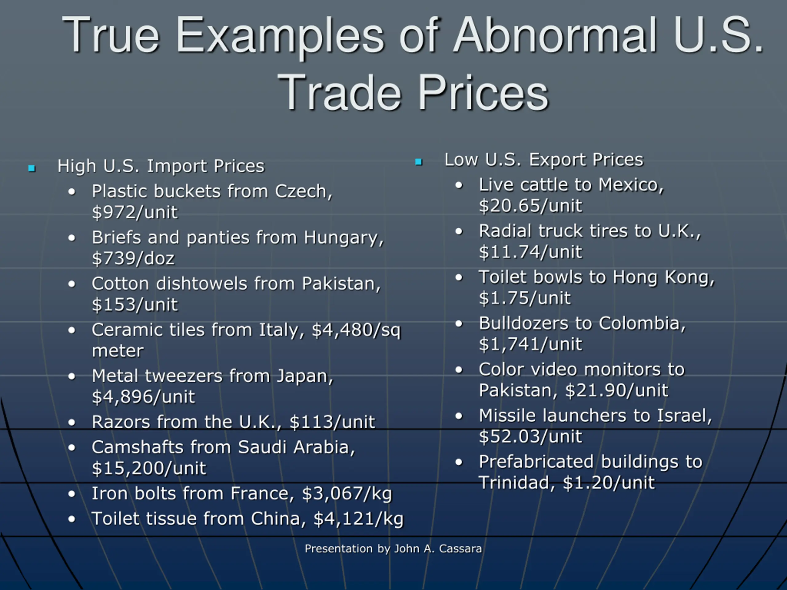 True Examples of Abnormal U.S. Trade Prices Low U.S. Export Prices Live cattle to Mexico, $20.65/unit Radial truck tires to U.K., $11.74/unit Toilet bowls to Hong Kong, $1.75/unit Bulldozers to Colombia, $1,741/unit Color video monitors to Pakistan, $21.90/unit Missile launchers to Israel, $52.03/unit Prefabricated buildings to Trinidad, $1.20/unit High U.S. Import Prices Plastic buckets from Czech, $972/unit Briefs and panties from Hungary, $739/doz Cotton dishtowels from Pakistan, $153/unit Ceramic tiles from Italy, $4,480/sq meter Metal tweezers from Japan, $4,896/unit Razors from the U.K., $113/unit Camshafts from Saudi Arabia, $15,200/unit Iron bolts from France, $3,067/kg Toilet tissue from China, $4,121/kg Presentation by John A. Cassara