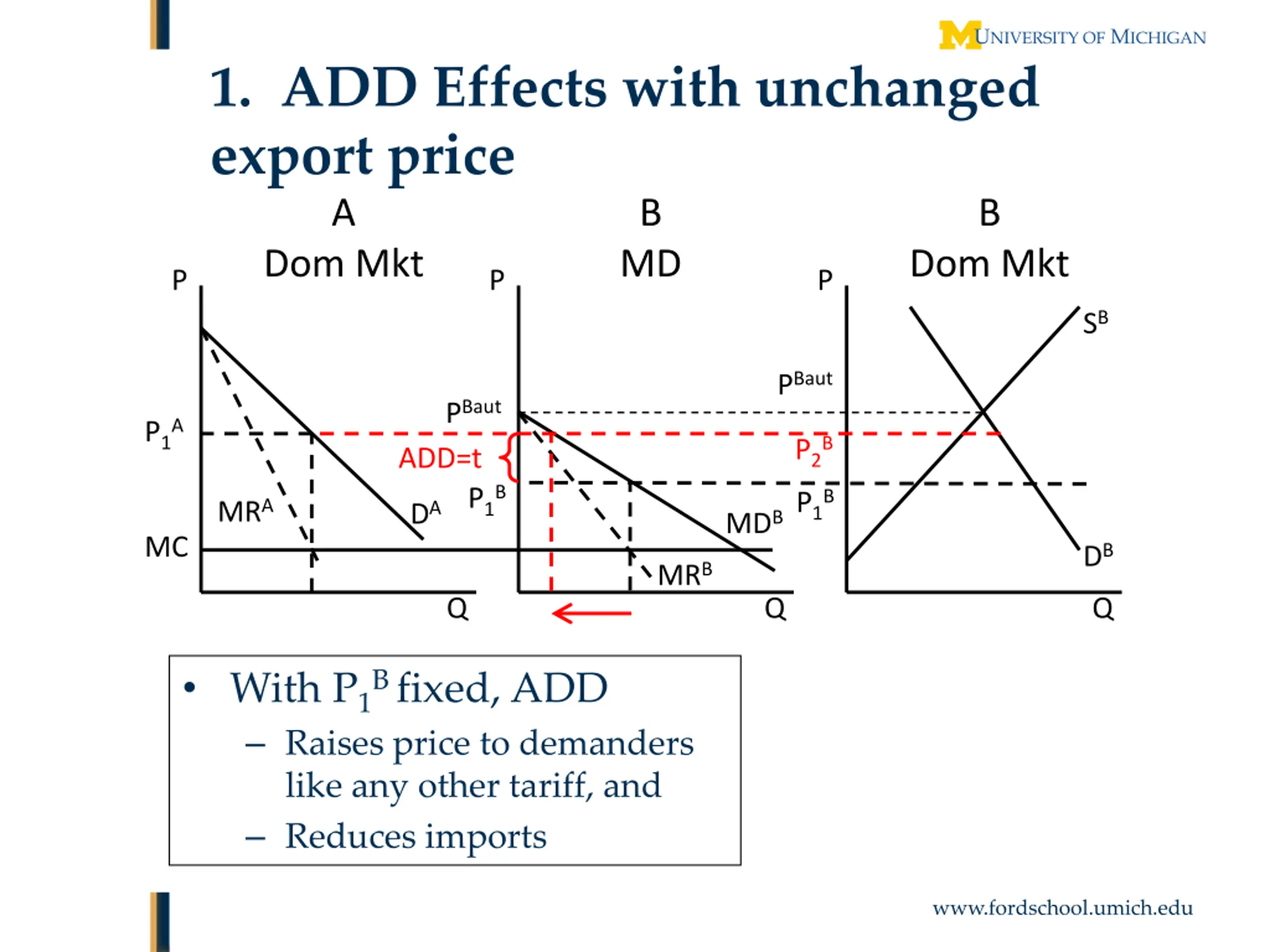 1. ADD Effects with unchanged export price A Dom Mkt P MD B B Dom Mkt P P SB PBaut PBaut P1A P2B ADD=t P1B P1B MRA DA MDB MC DB MRB Q Q Q With P1B fixed, ADD Raises price to demanders like any other tariff, and Reduces imports www.fordschool.umich.edu