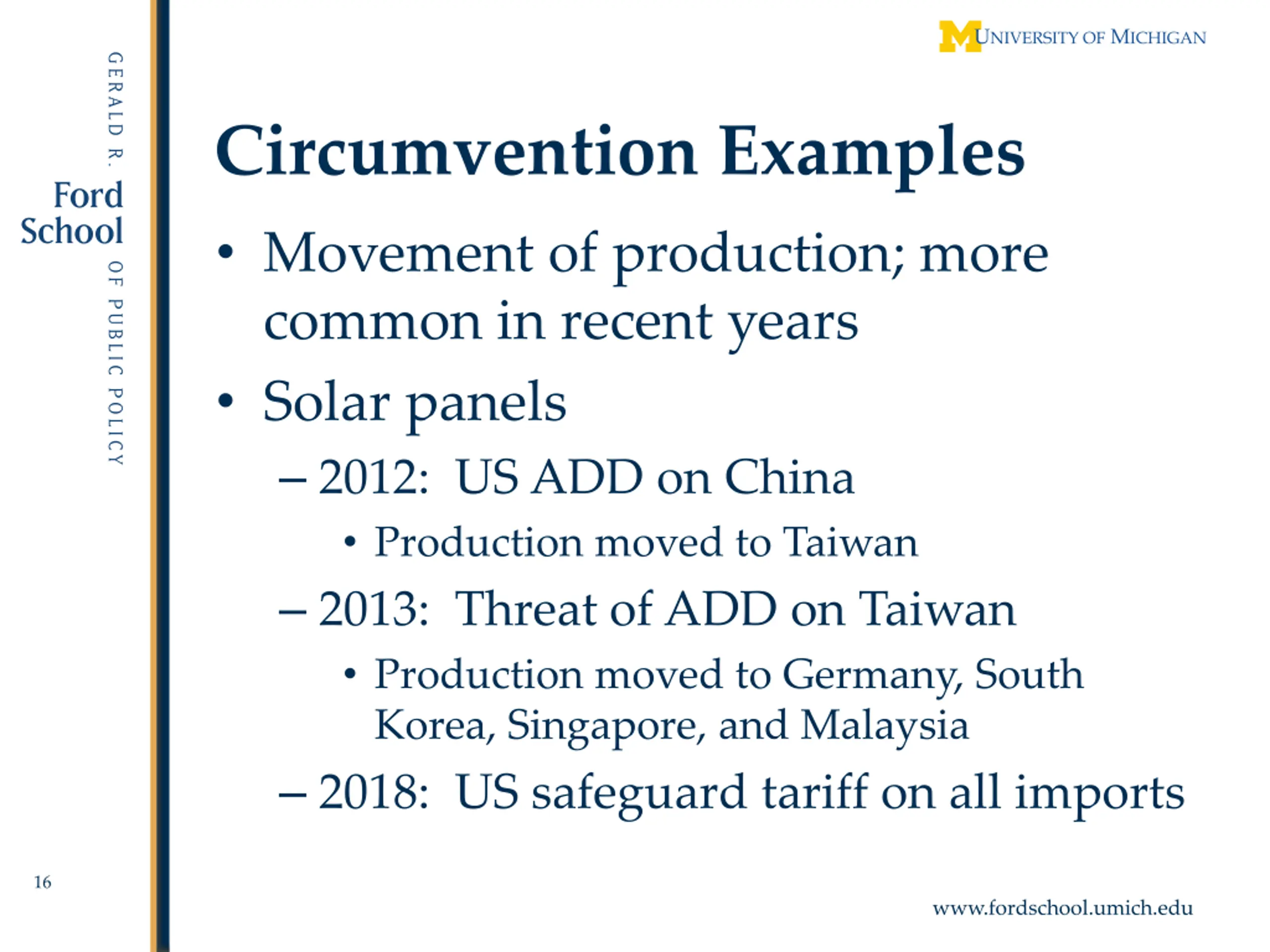 Circumvention Examples Movement of production; more common in recent years Solar panels 2012: US ADD on China Production moved to Taiwan 2013: Threat of ADD on Taiwan Production moved to Germany, South Korea, Singapore, and Malaysia 2018: US safeguard tariff on all imports 16 www.fordschool.umich.edu