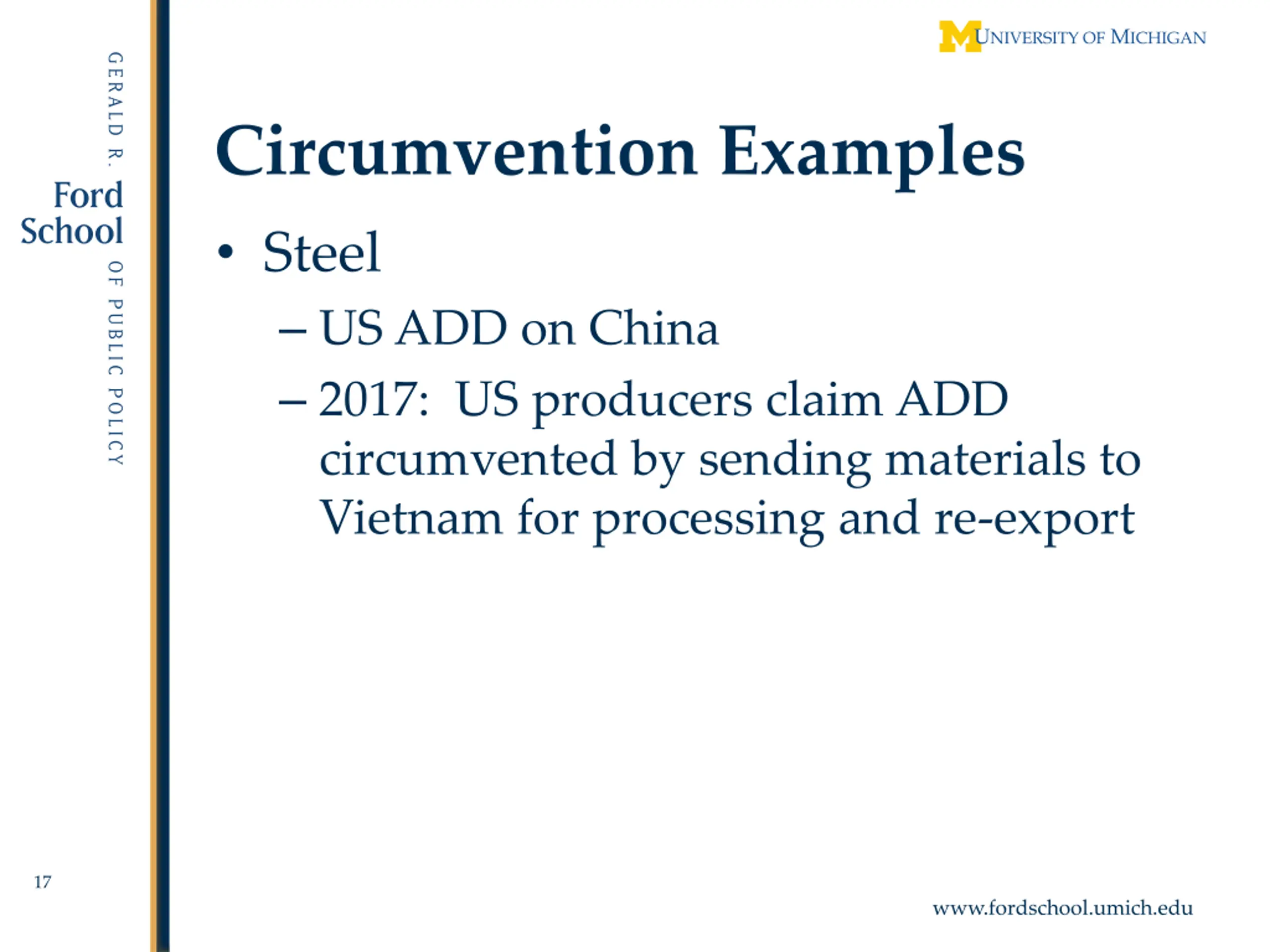 Circumvention Examples Steel US ADD on China 2017: US producers claim ADD circumvented by sending materials to Vietnam for processing and re-export 17 www.fordschool.umich.edu
