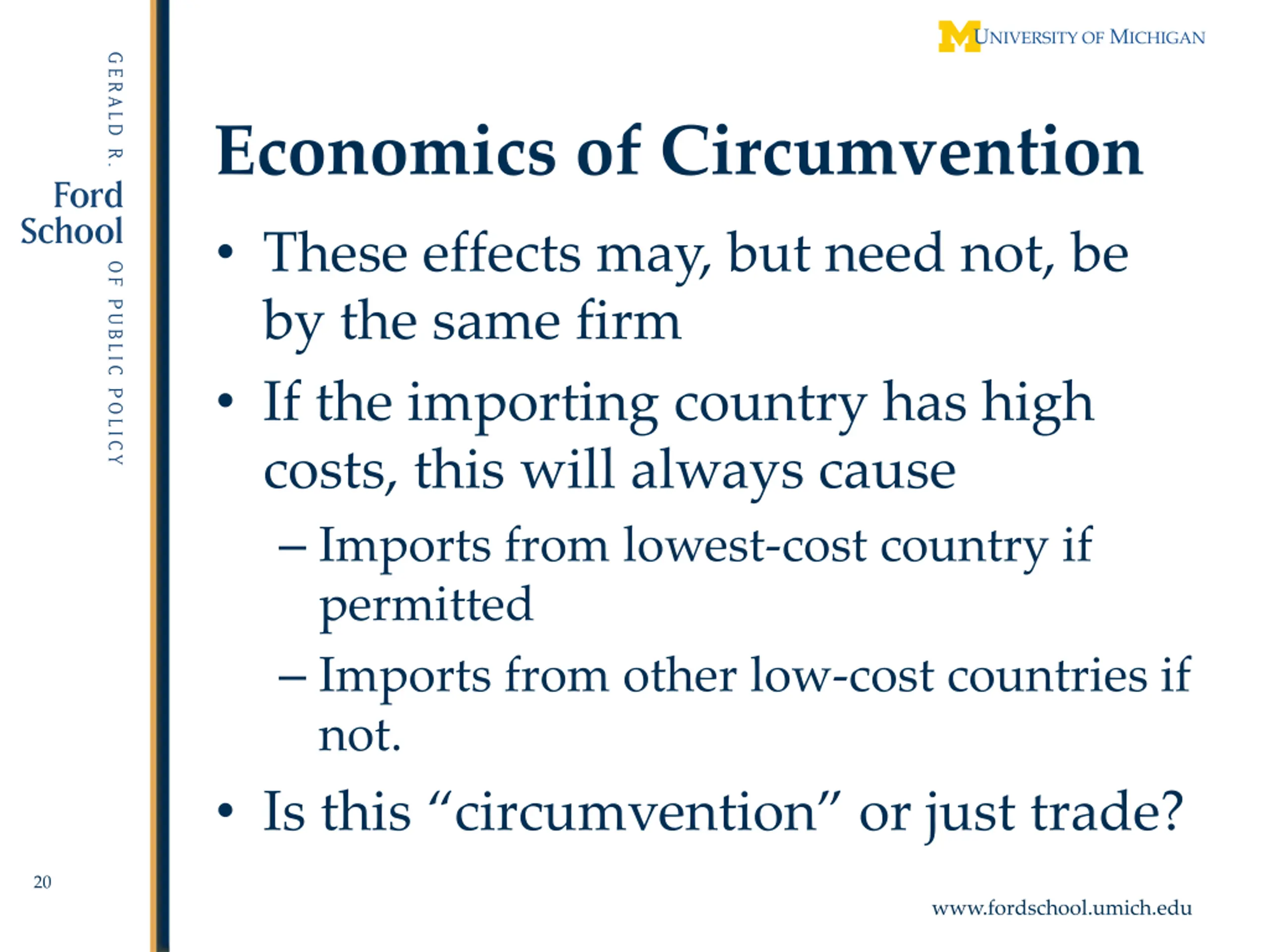 Economics of Circumvention These effects may, but need not, be by the same firm If the importing country has high costs, this will always cause Imports from lowest-cost country if permitted Imports from other low-cost countries if not. Is this circumvention or just trade? 20 www.fordschool.umich.edu