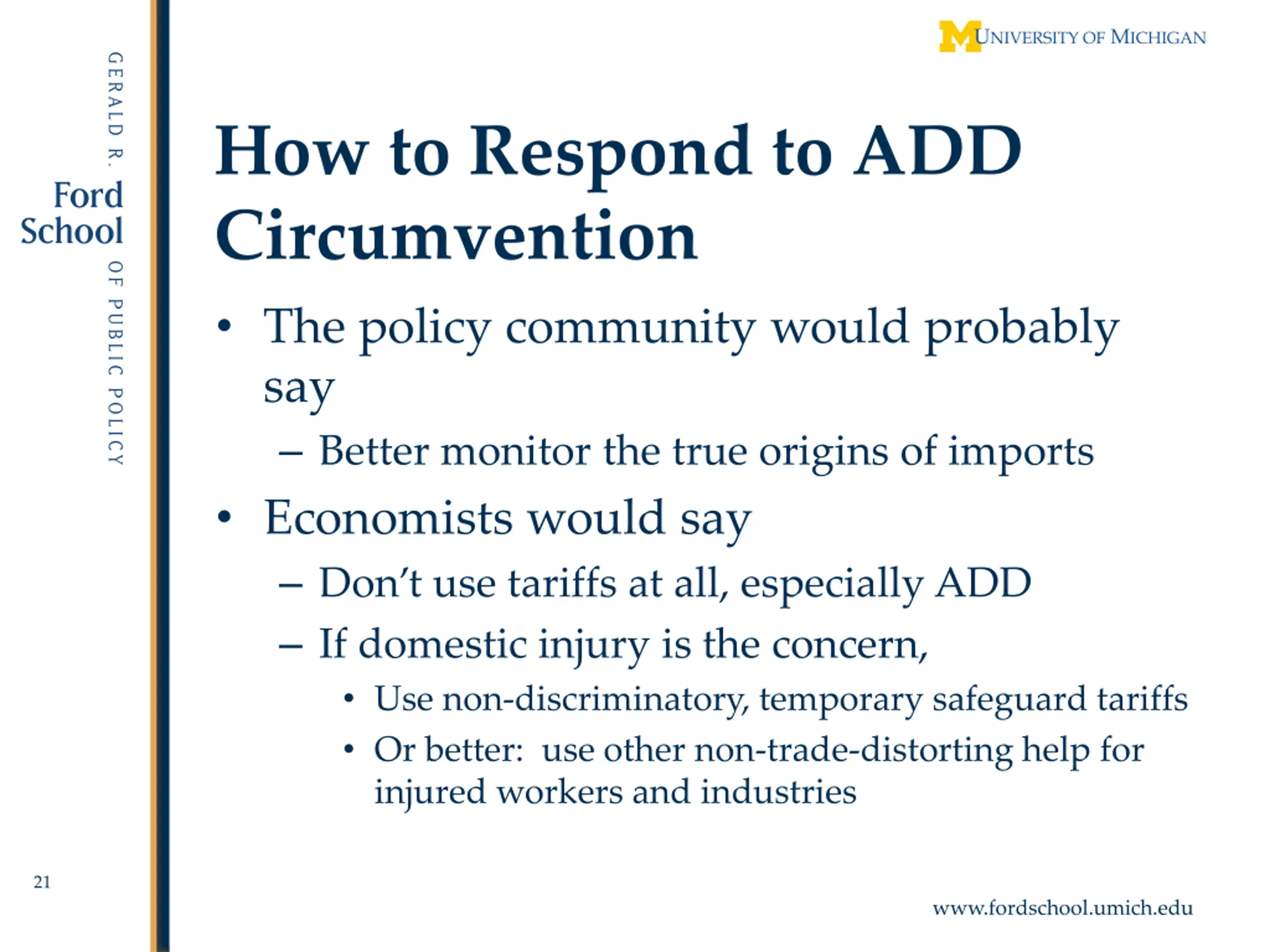 How to Respond to ADD Circumvention The policy community would probably say Better monitor the true origins of imports Economists would say Don t use tariffs at all, especially ADD If domestic injury is the concern, Use non-discriminatory, temporary safeguard tariffs Or better: use other non-trade-distorting help for injured workers and industries 21 www.fordschool.umich.edu