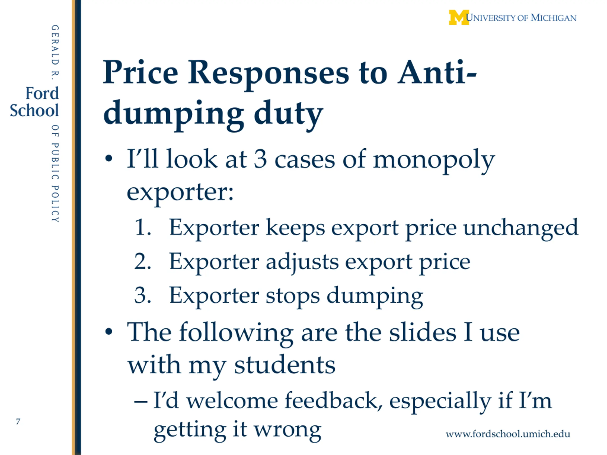 Price Responses to Anti- dumping duty I ll look at 3 cases of monopoly exporter: 1. Exporter keeps export price unchanged 2. Exporter adjusts export price 3. Exporter stops dumping The following are the slides I use with my students I d welcome feedback, especially if I m getting it wrong 7 www.fordschool.umich.edu