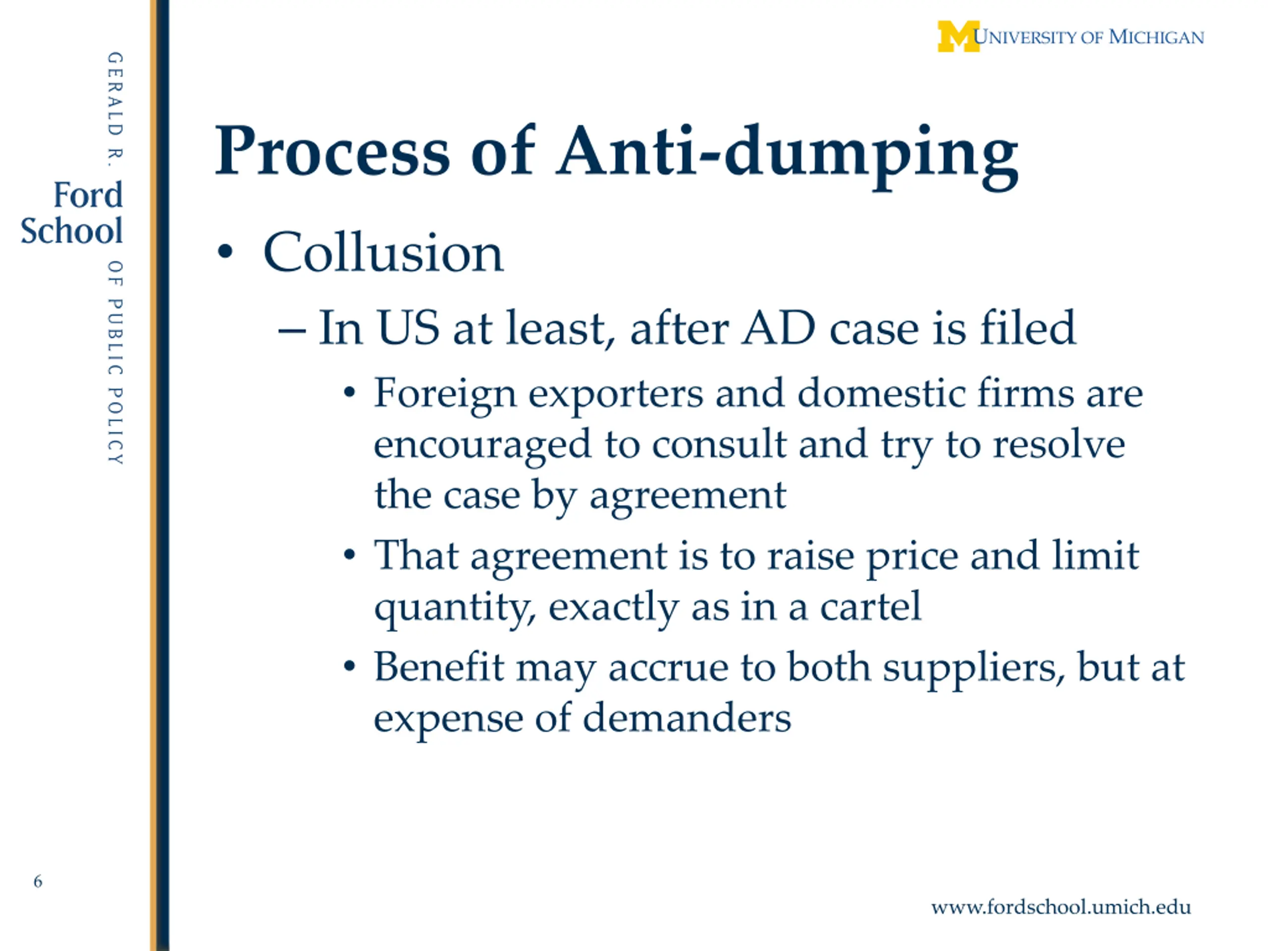 Process of Anti-dumping Collusion In US at least, after AD case is filed Foreign exporters and domestic firms are encouraged to consult and try to resolve the case by agreement That agreement is to raise price and limit quantity, exactly as in a cartel Benefit may accrue to both suppliers, but at expense of demanders 6 www.fordschool.umich.edu