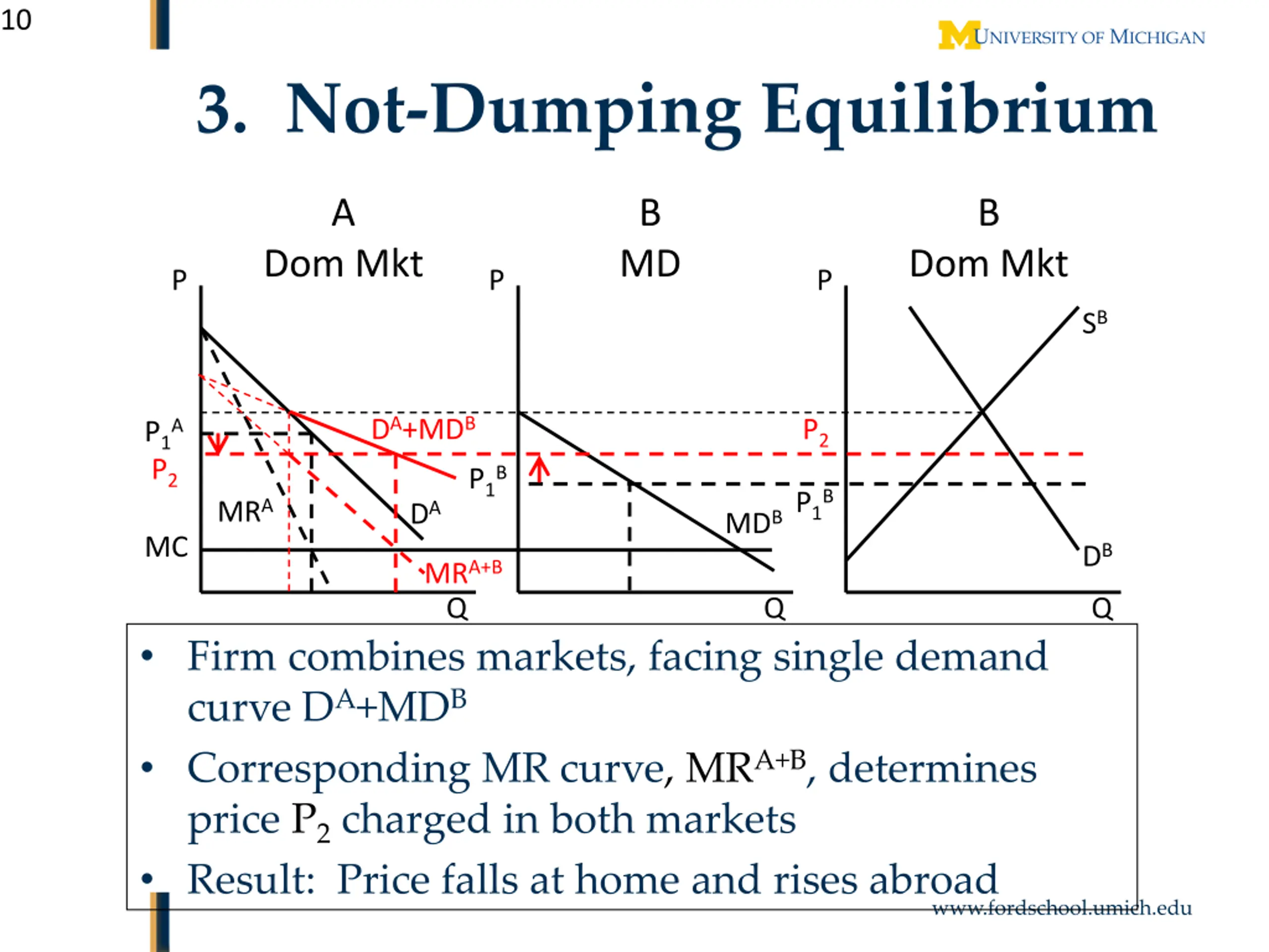 10 3. Not-Dumping Equilibrium A B B Dom Mkt MD Dom Mkt P P P SB DA+MDB P2 P1A P2 P1B P1B MRA DA MDB MC DB MRA+B Q Q Q Firm combines markets, facing single demand curve DA+MDB Corresponding MR curve, MRA+B, determines price P2 charged in both markets Result: Price falls at home and rises abroad www.fordschool.umich.edu