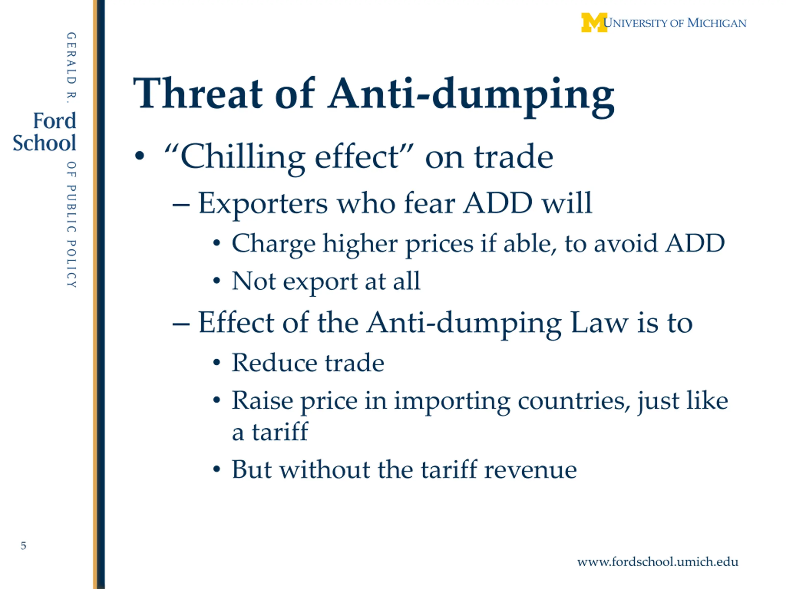 Threat of Anti-dumping Chilling effect on trade Exporters who fear ADD will Charge higher prices if able, to avoid ADD Not export at all Effect of the Anti-dumping Law is to Reduce trade Raise price in importing countries, just like a tariff But without the tariff revenue 5 www.fordschool.umich.edu