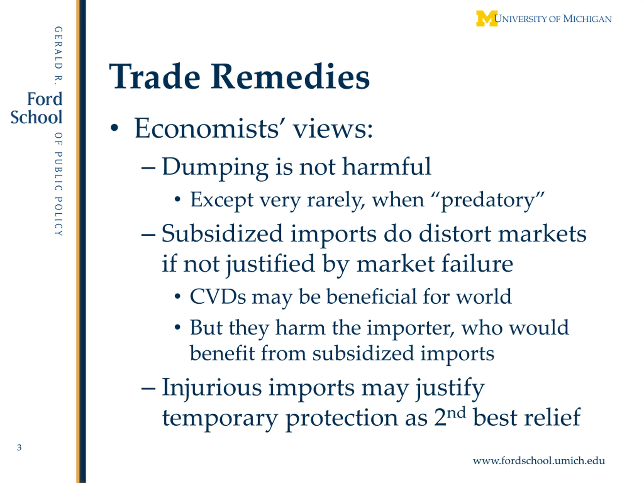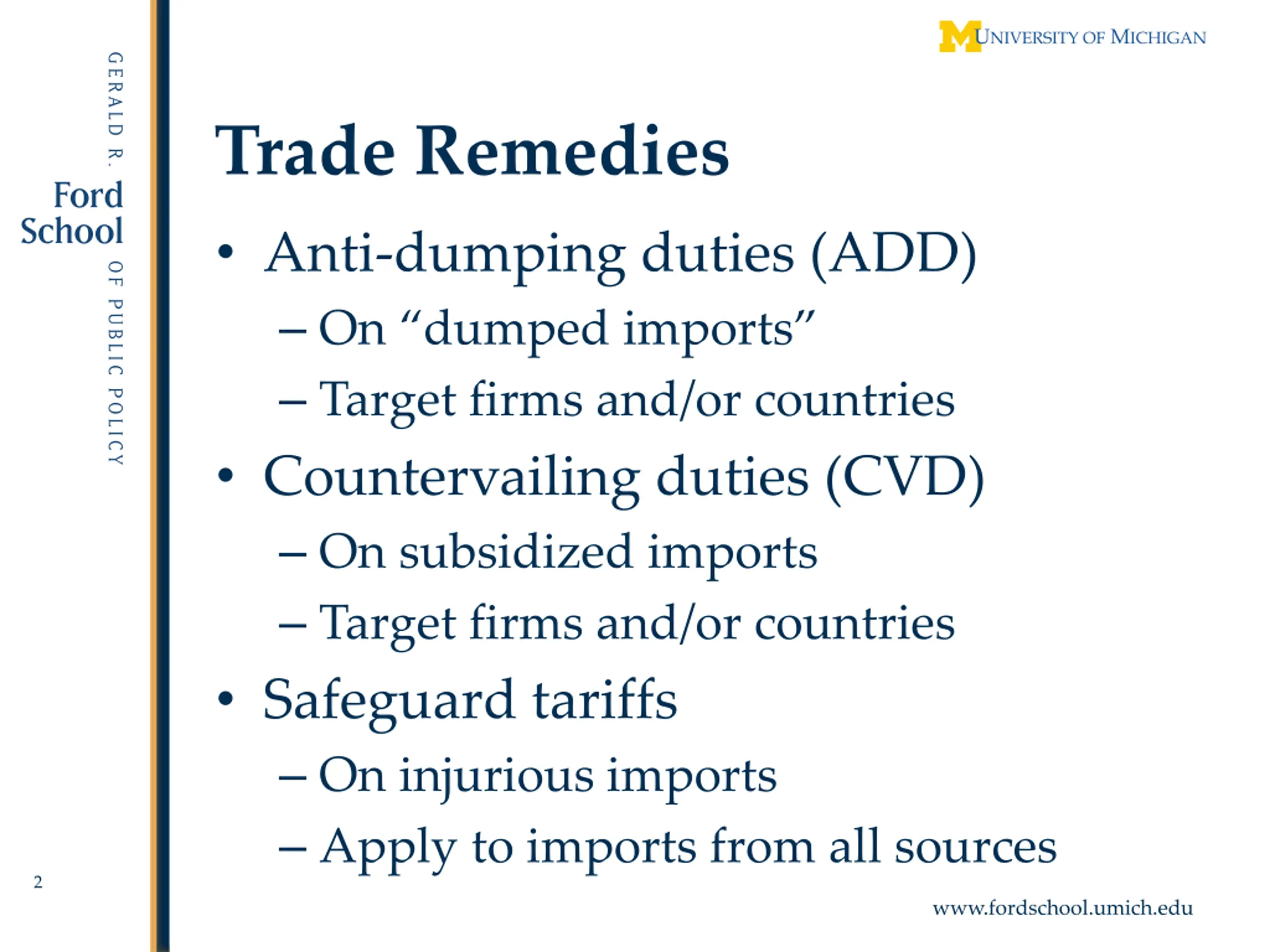 Trade Remedies Anti-dumping duties (ADD) On dumped imports Target firms and/or countries Countervailing duties (CVD) On subsidized imports Target firms and/or countries Safeguard tariffs On injurious imports Apply to imports from all sources 2 www.fordschool.umich.edu