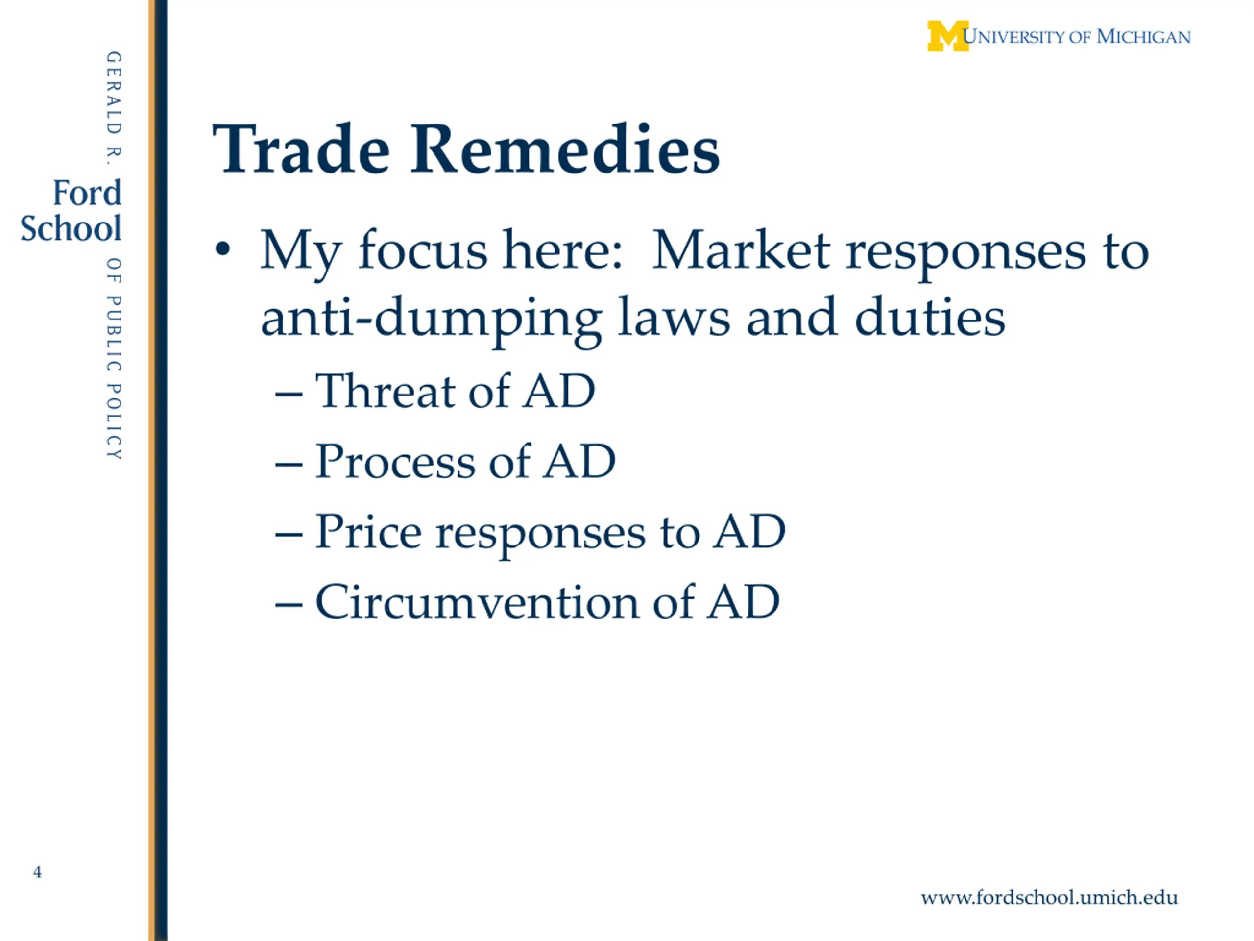 Trade Remedies My focus here: Market responses to anti-dumping laws and duties Threat of AD Process of AD Price responses to AD Circumvention of AD 4 www.fordschool.umich.edu