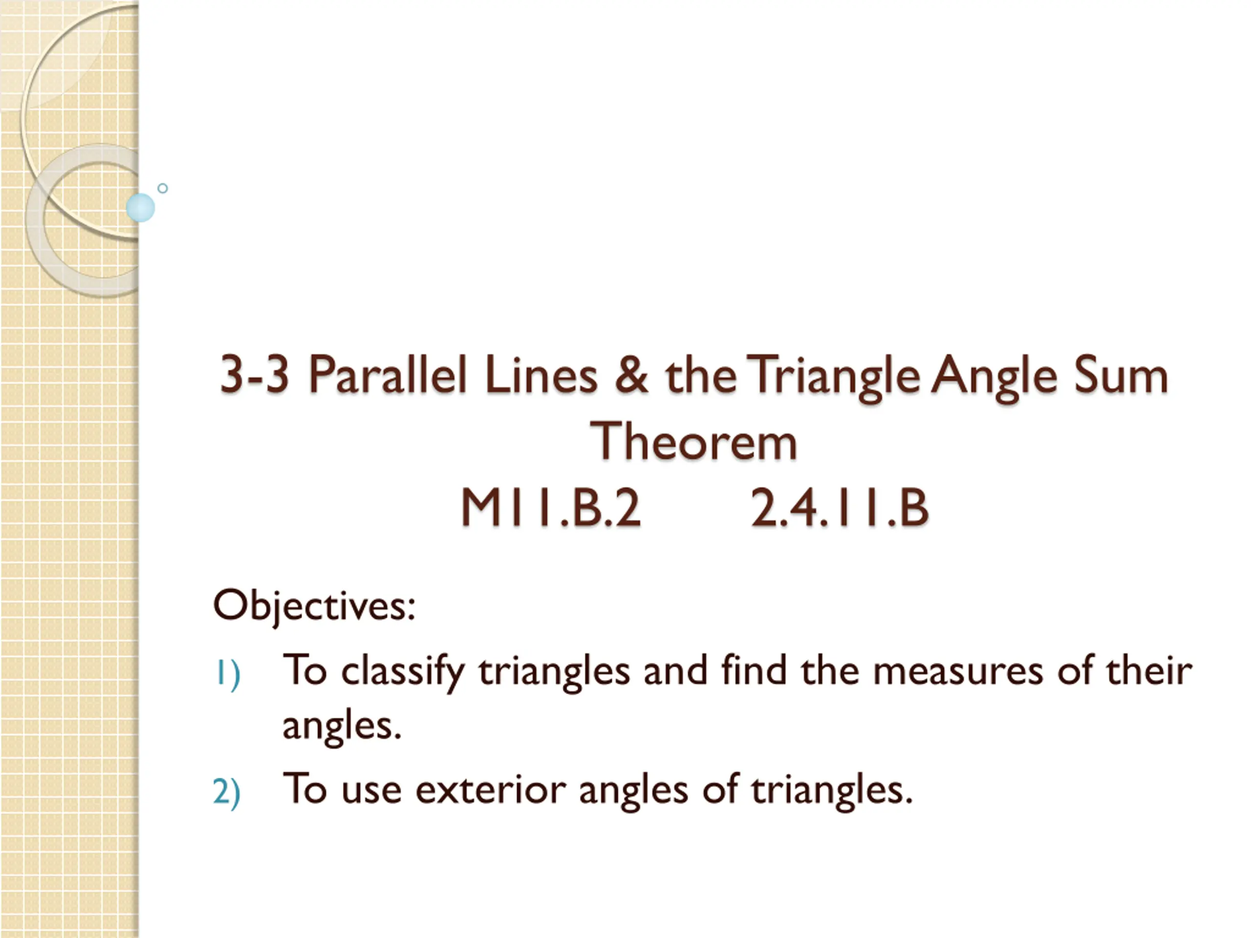 3-3 Parallel Lines & the Triangle Angle Sum Theorem M11.B.2 2.4.11.B Objectives: 1) To classify triangles and find the measures of their angles. 2) To use exterior angles of triangles.