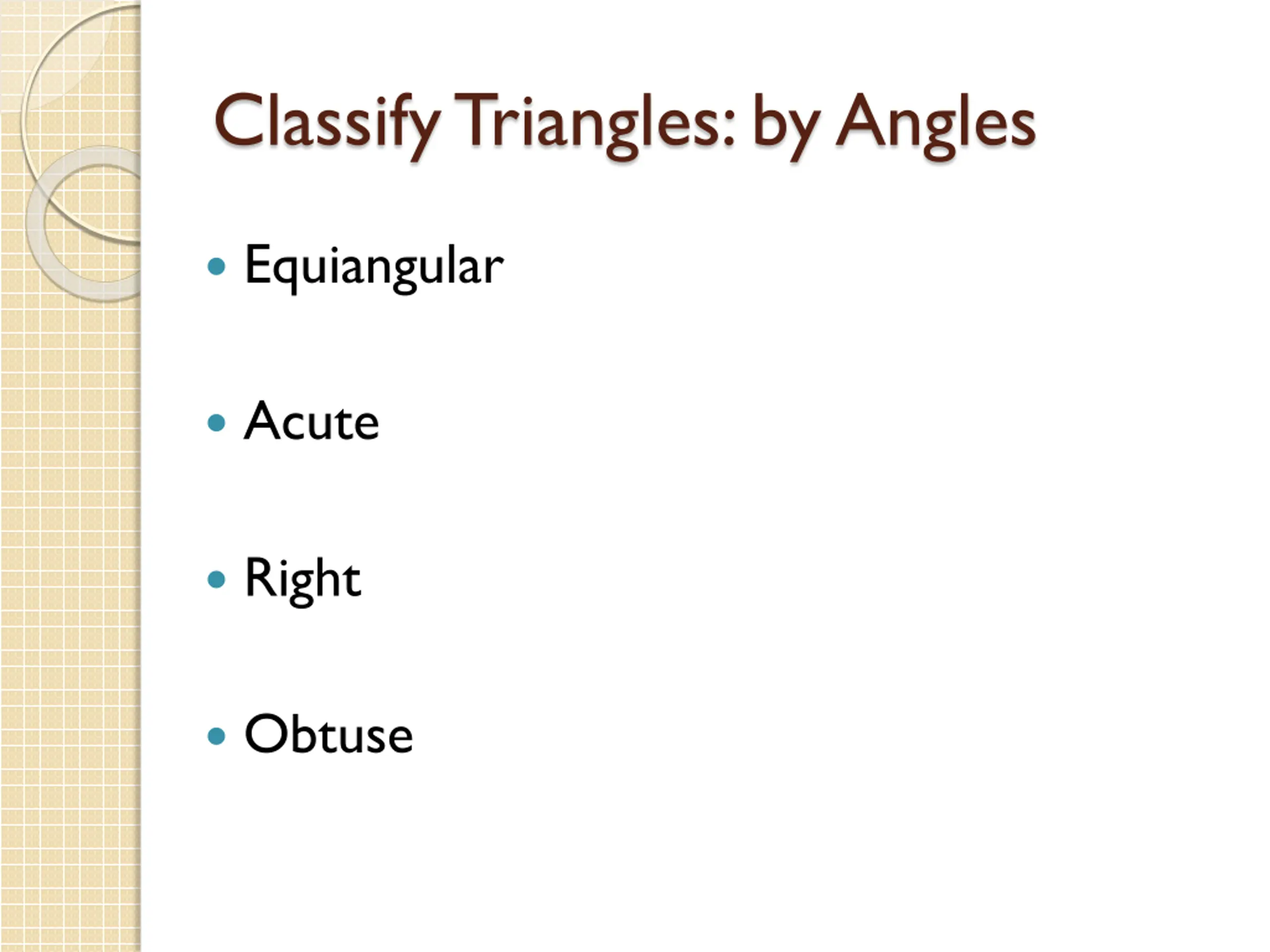 Classify Triangles: by Angles Equiangular Acute Right Obtuse