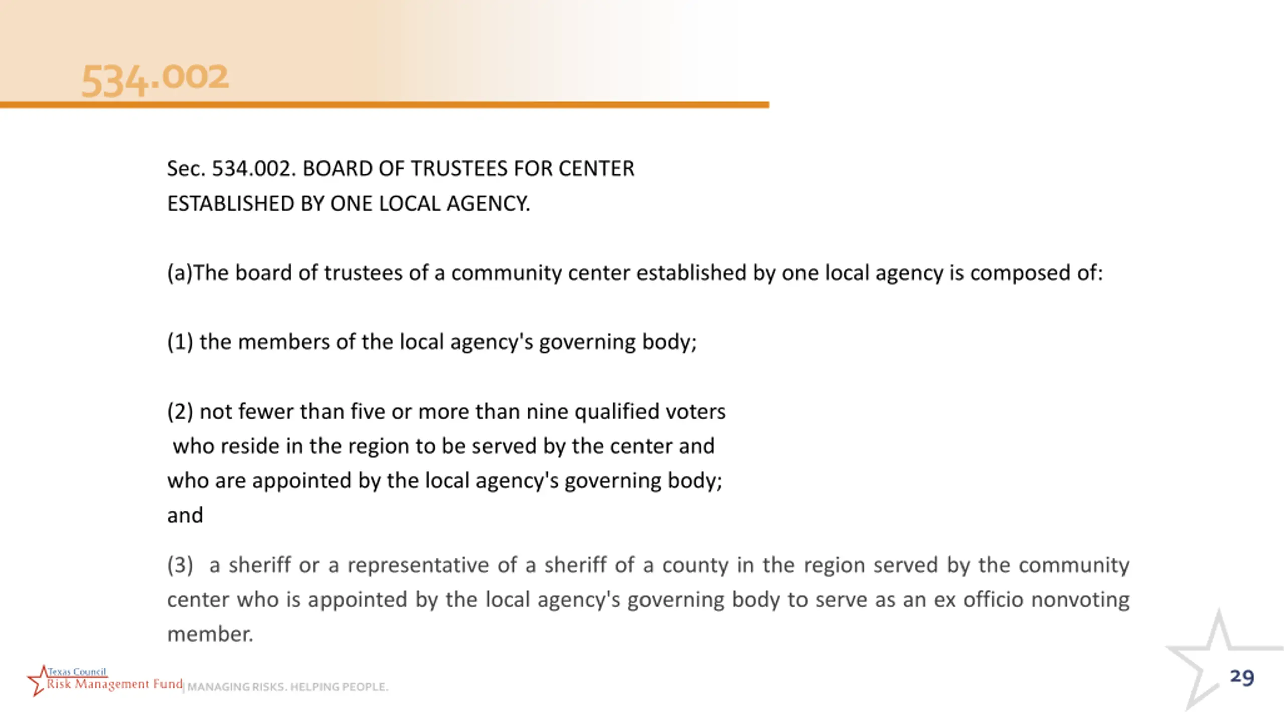 534.002 Sec. 534.002. BOARD OF TRUSTEES FOR CENTER ESTABLISHED BY ONE LOCAL AGENCY. (a)The board of trustees of a community center established by one local agency is composed of: (1) the members of the local agency's governing body; (2) not fewer than five or more than nine qualified voters who reside in the region to be served by the center and who are appointed by the local agency's governing body; and (3) a sheriff or a representative of a sheriff of a county in the region served by the community center who is appointed by the local agency's governing body to serve as an ex officio nonvoting member. 29 | MANAGING RISKS. HELPING PEOPLE.