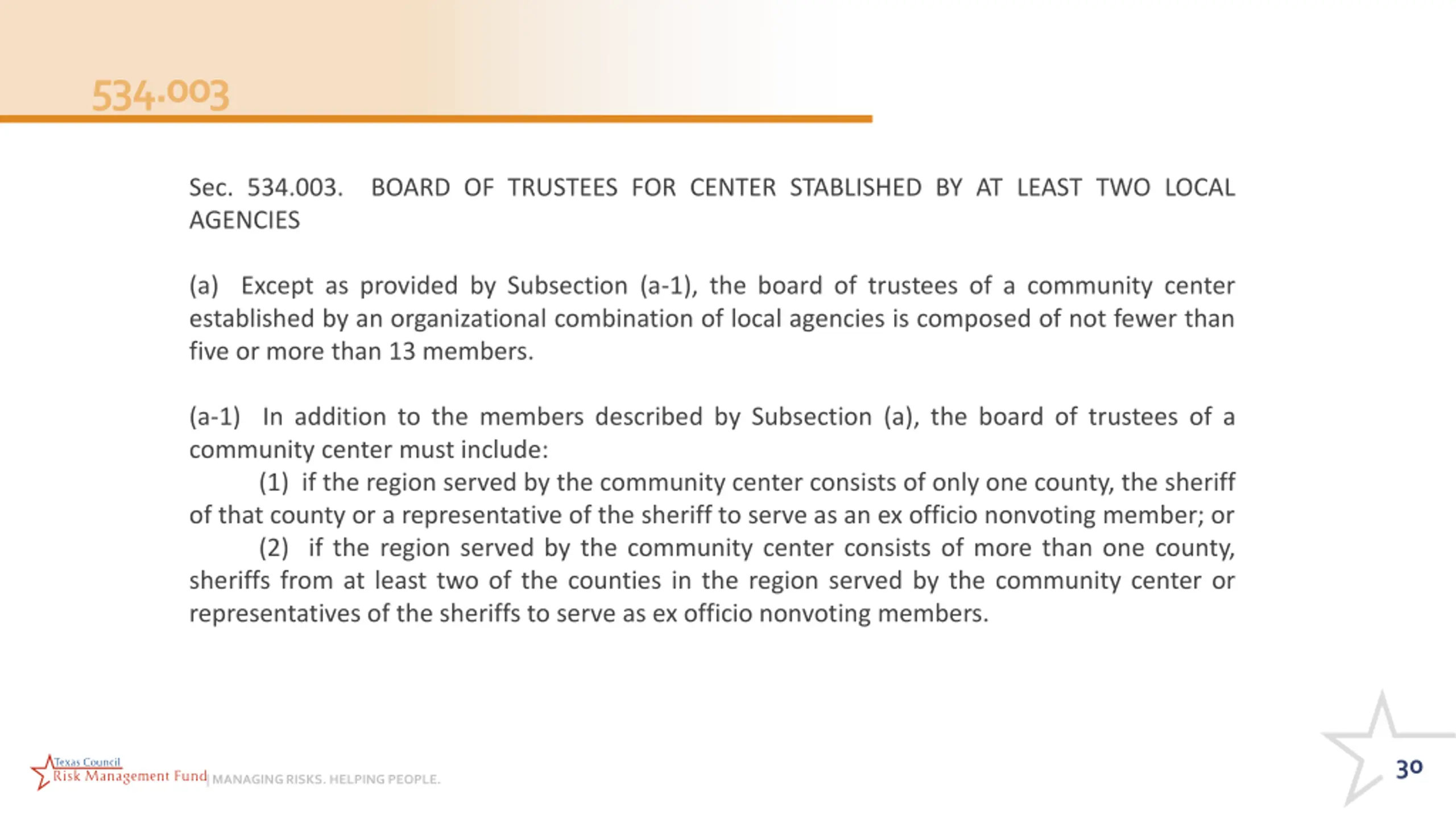 534.003 Sec. 534.003. BOARD OF TRUSTEES FOR CENTER STABLISHED BY AT LEAST TWO LOCAL AGENCIES (a) Except as provided by Subsection (a-1), the board of trustees of a community center established by an organizational combination of local agencies is composed of not fewer than five or more than 13 members. (a-1) In addition to the members described by Subsection (a), the board of trustees of a community center must include: (1) if the region served by the community center consists of only one county, the sheriff of that county or a representative of the sheriff to serve as an ex officio nonvoting member; or (2) if the region served by the community center consists of more than one county, sheriffs from at least two of the counties in the region served by the community center or representatives of the sheriffs to serve as ex officio nonvoting members. 30 | MANAGING RISKS. HELPING PEOPLE.