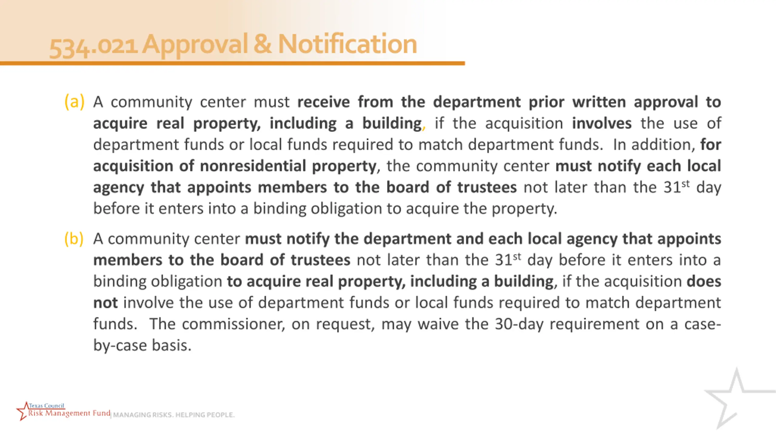 534.021 Approval & Notification (a) A community center must receive from the departmentprior written approval to acquire real property, including a building, if the acquisition involves the use of department funds or local funds required to match department funds. In addition, for acquisition of nonresidential property, the community center must notify each local agency that appoints members to the board of trustees not later than the 31st day before it enters into a binding obligation to acquire the property. (b) A community center must notify the department and each local agency that appoints members to the board of trustees not later than the 31st day before it enters into a binding obligation to acquire real property, including a building, if the acquisition does not involve the use of department funds or local funds required to match department funds. The commissioner, on request, may waive the 30-day requirement on a case- by-case basis. | MANAGING RISKS. HELPING PEOPLE.