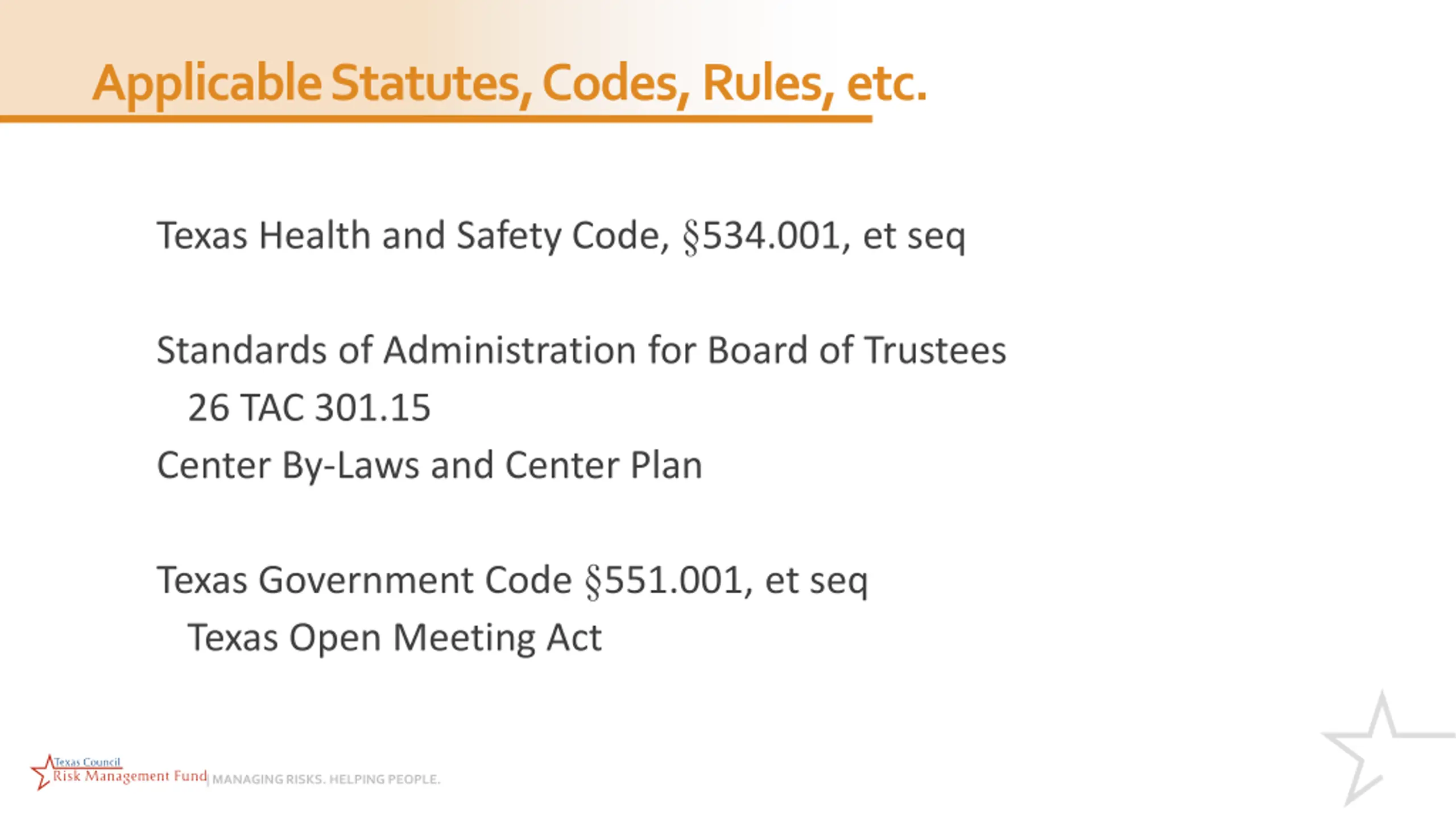 Applicable Statutes, Codes, Rules, etc. Texas Health and Safety Code, 534.001, et seq Standards of Administration for Board of Trustees 26 TAC 301.15 Center By-Laws and Center Plan Texas Government Code 551.001, et seq Texas Open Meeting Act | MANAGING RISKS. HELPING PEOPLE.