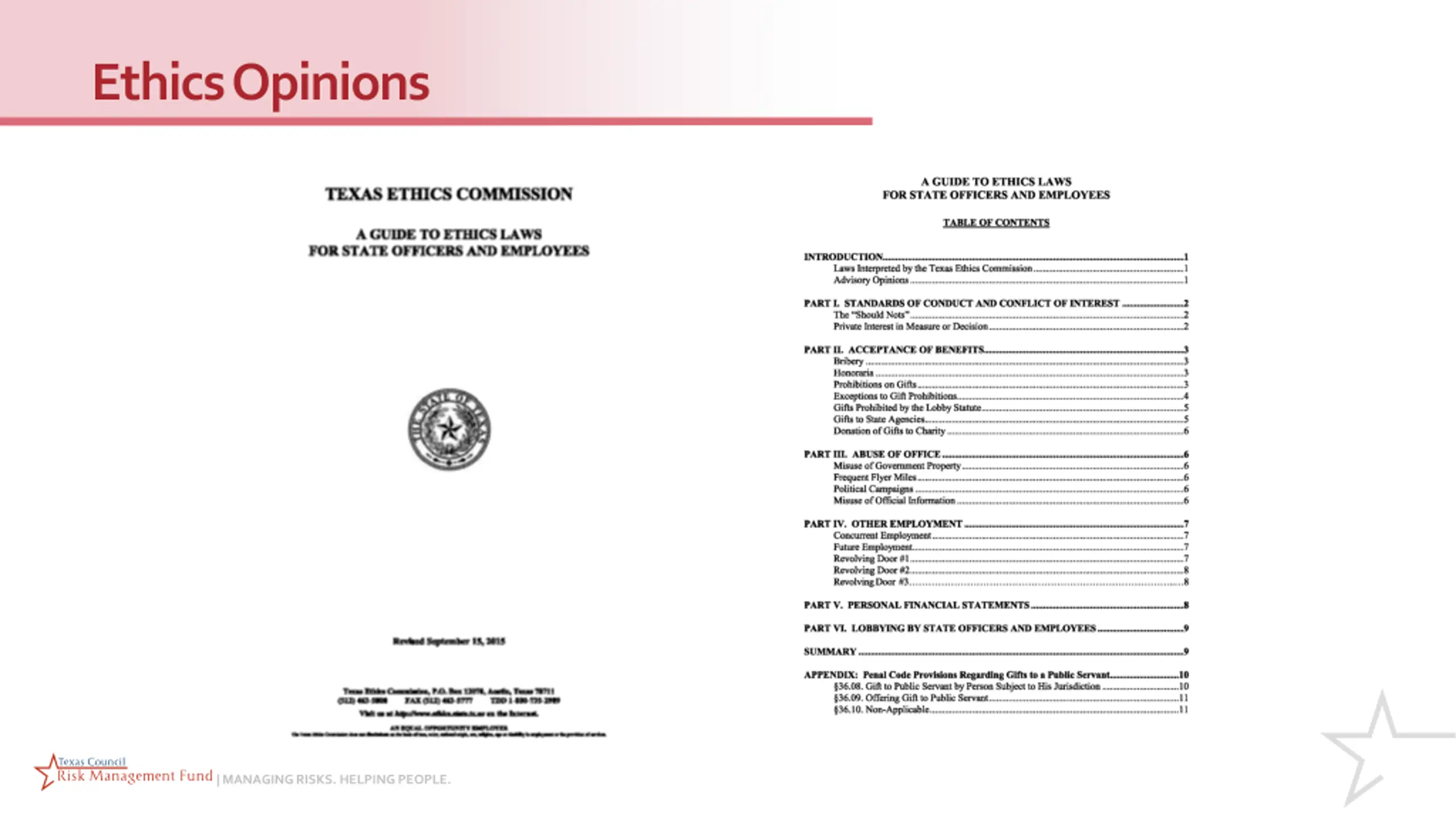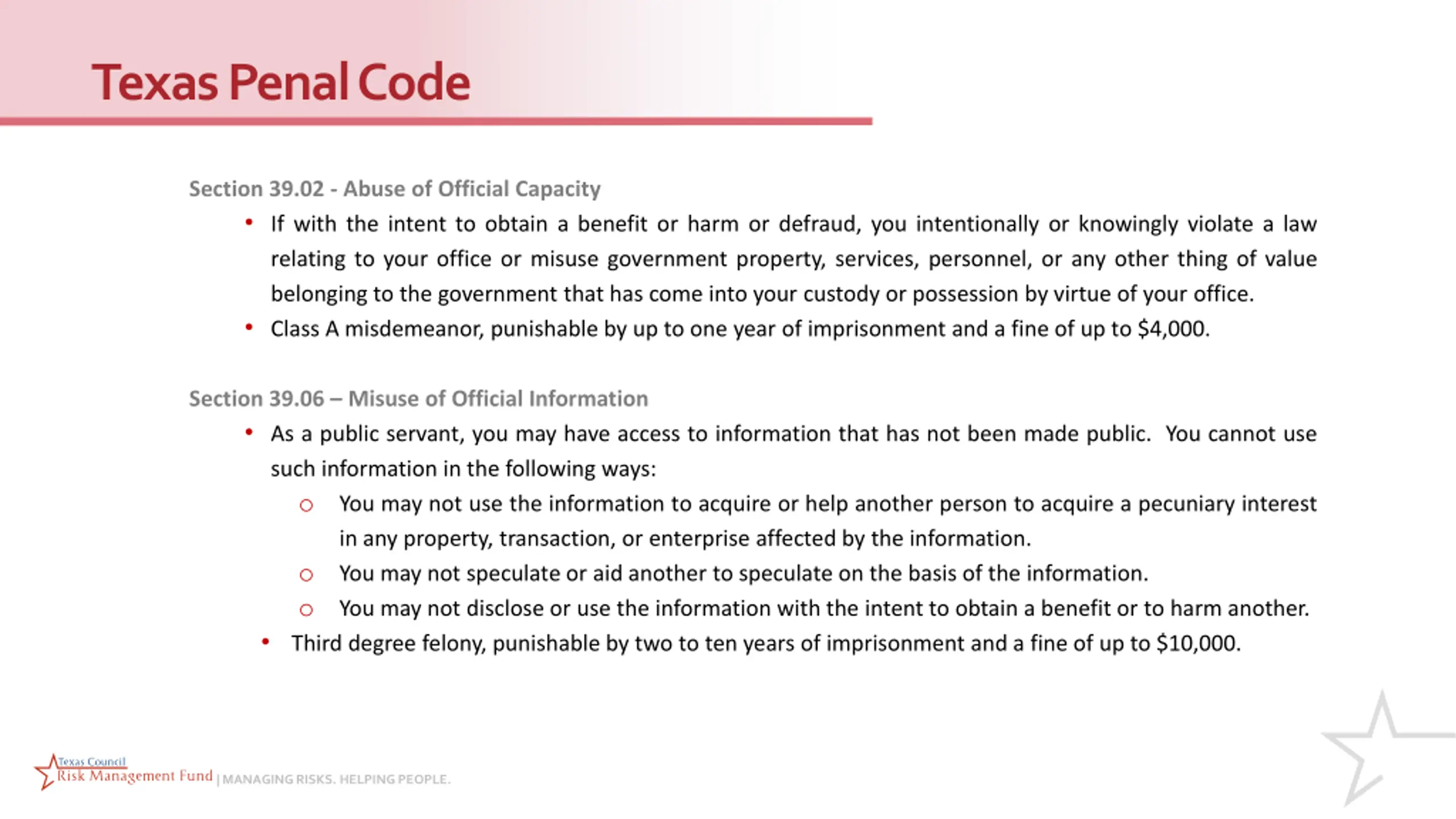 Texas Penal Code Section 39.02 - Abuse of Official Capacity If with the intent to obtain a benefit or harm or defraud, you intentionally or knowingly violate a law relating to your office or misuse government property, services, personnel, or any other thing of value belonging to the government that has come into your custody or possession by virtue of your office. Class A misdemeanor, punishable by up to one year of imprisonment and a fine of up to $4,000. Section 39.06 Misuse of Official Information As a public servant, you may have access to information that has not been made public. You cannot use such information in the following ways: o You may not use the information to acquire or help another person to acquire a pecuniary interest in any property, transaction, or enterprise affected by the information. o You may not speculate or aid another to speculate on the basis of the information. o You may not disclose or use the information with the intent to obtain a benefit or to harm another. Third degree felony, punishable by two to ten years of imprisonment and a fine of up to $10,000. | MANAGING RISKS. HELPING PEOPLE.