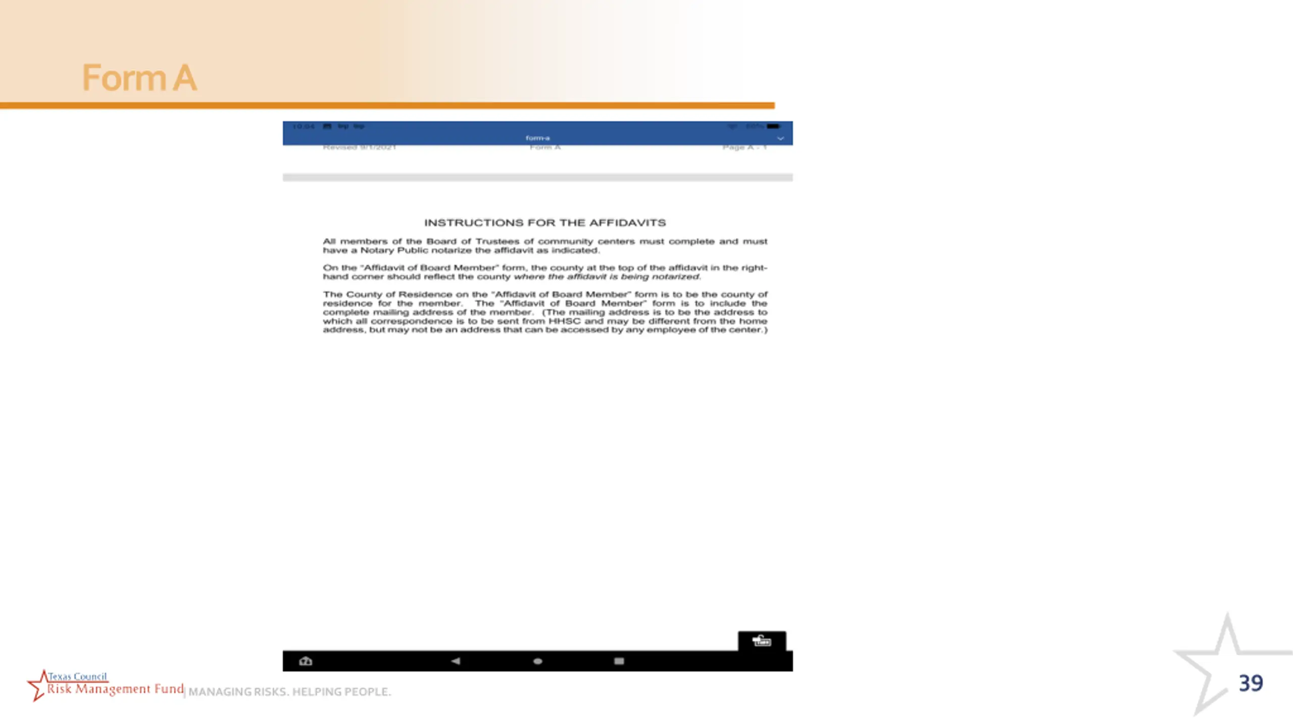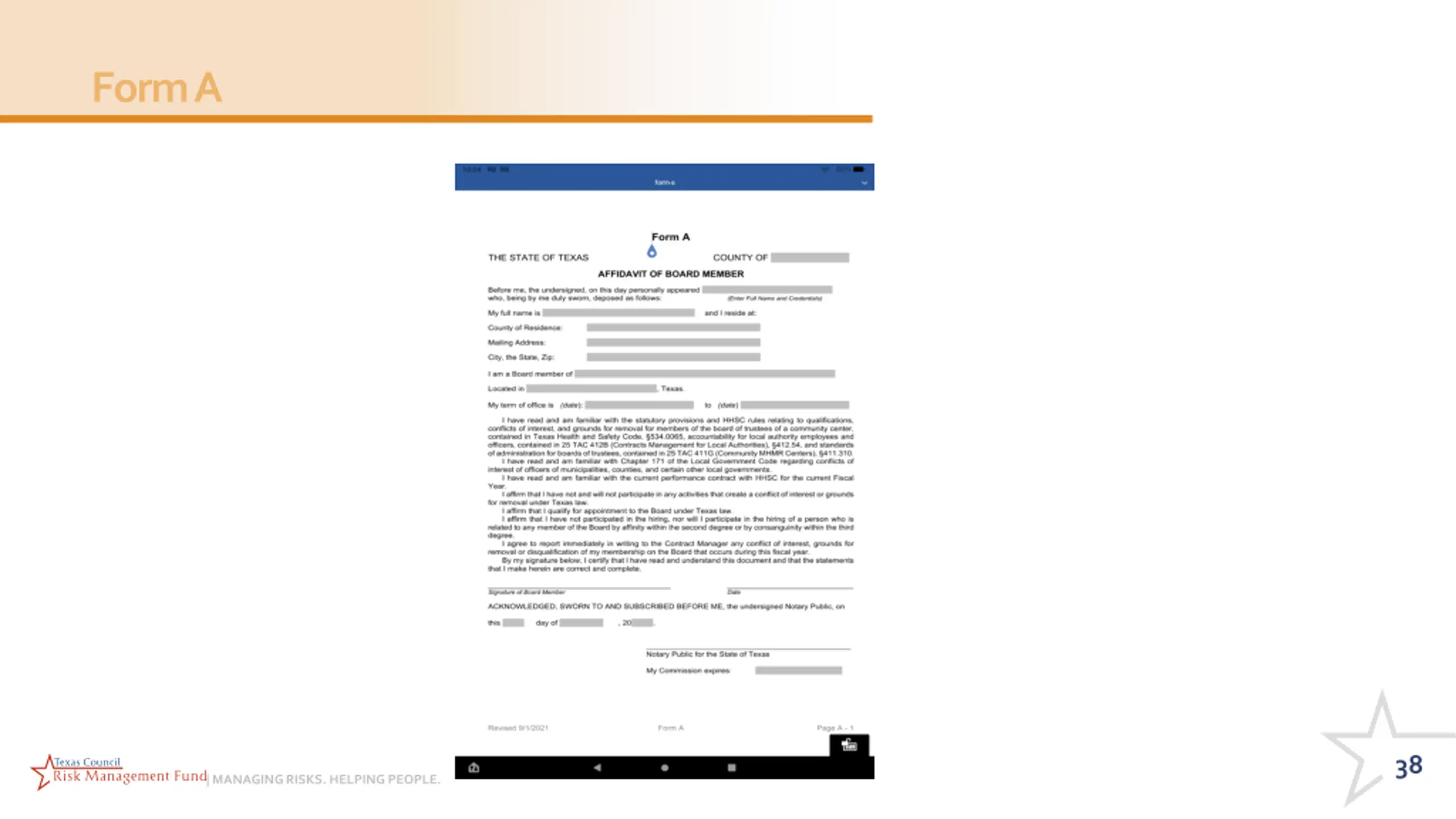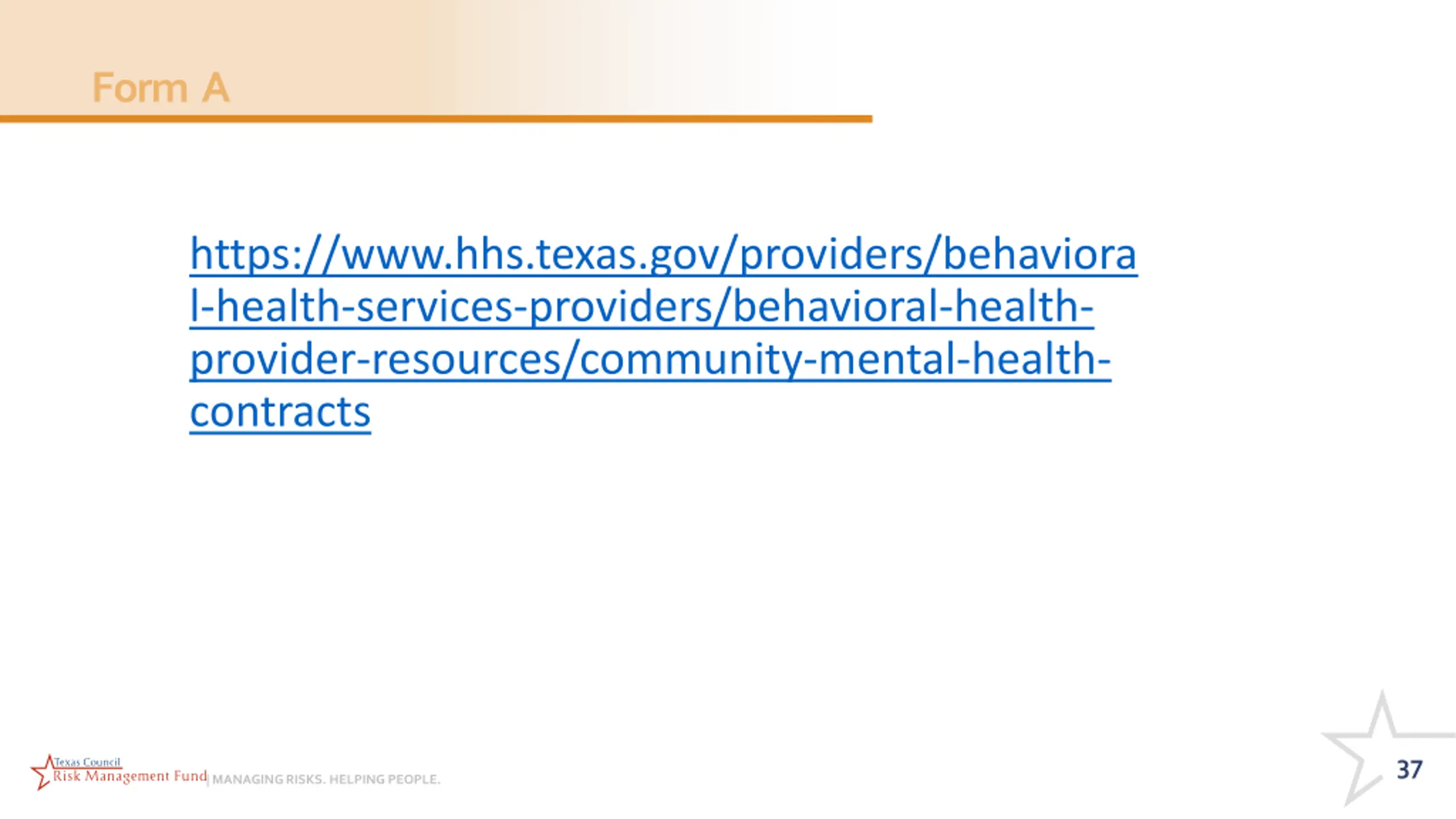 Form A https://www.hhs.texas.gov/providers/behaviora l-health-services-providers/behavioral-health- provider-resources/community-mental-health- contracts 37 | MANAGING RISKS. HELPING PEOPLE.