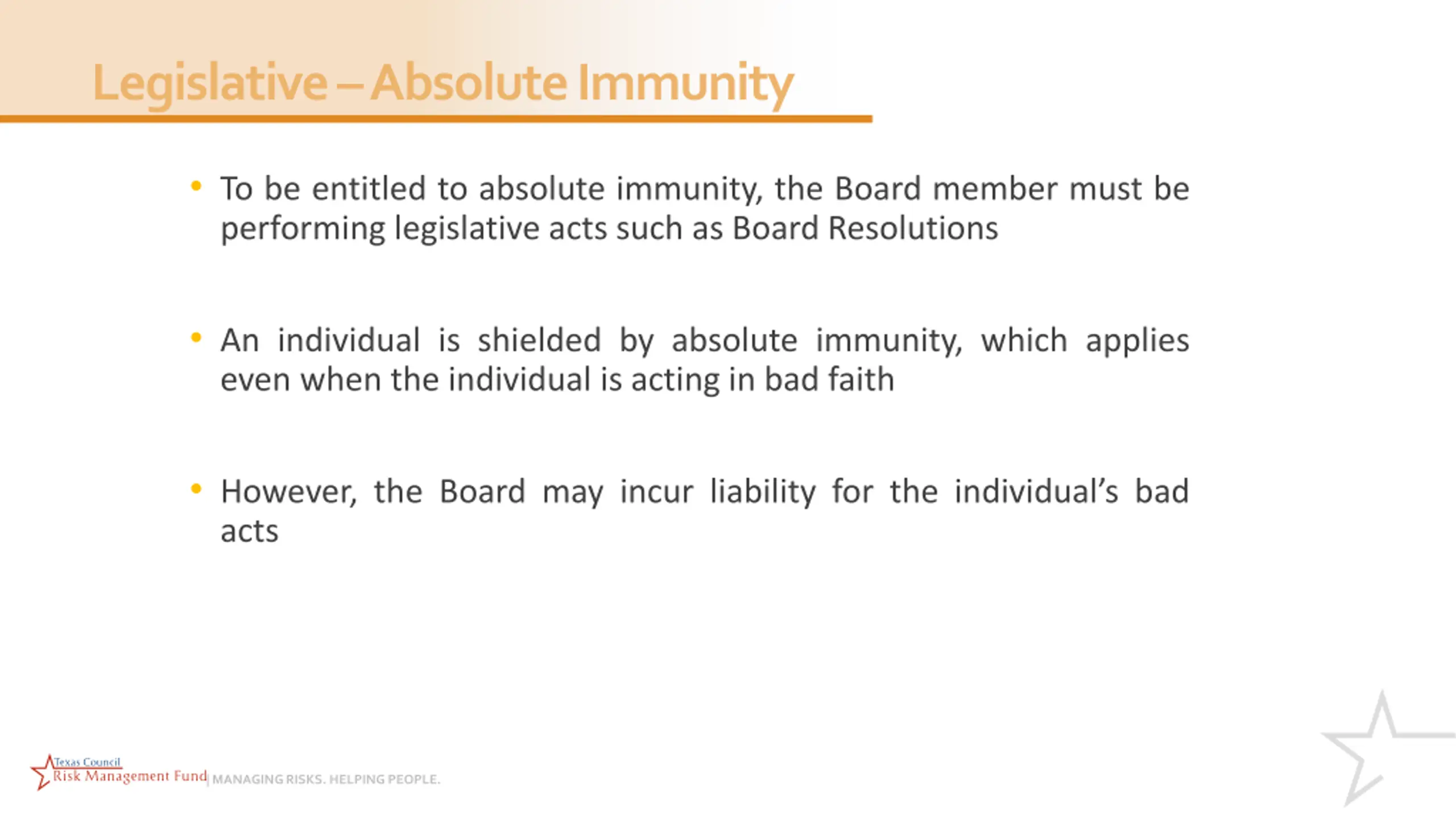 Legislative Absolute Immunity To be entitled to absolute immunity, the Board member must be performing legislative acts such as Board Resolutions An individual is shielded by absolute immunity, which applies even when the individual is acting in bad faith However, the Board may incur liability for the individual s bad acts | MANAGING RISKS. HELPING PEOPLE.