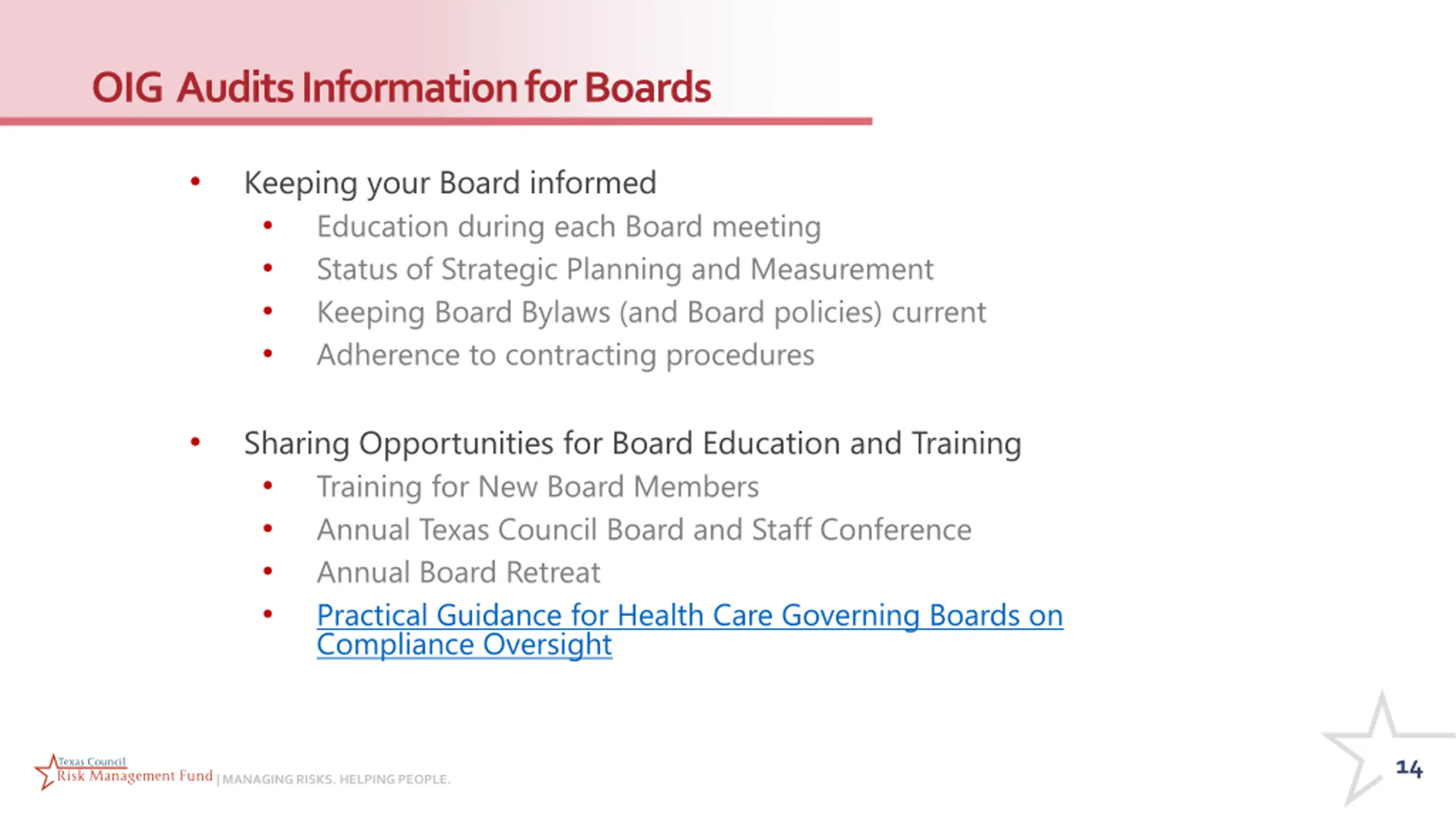 OIG Audits Information for Boards Keeping your Board informed Education during each Board meeting Status of Strategic Planning and Measurement Keeping Board Bylaws (and Board policies) current Adherence to contracting procedures Sharing Opportunities for Board Education and Training Training for New Board Members Annual Texas Council Board and Staff Conference Annual Board Retreat Practical Guidance for Health Care Governing Boards on Compliance Oversight 14 | MANAGING RISKS. HELPING PEOPLE.