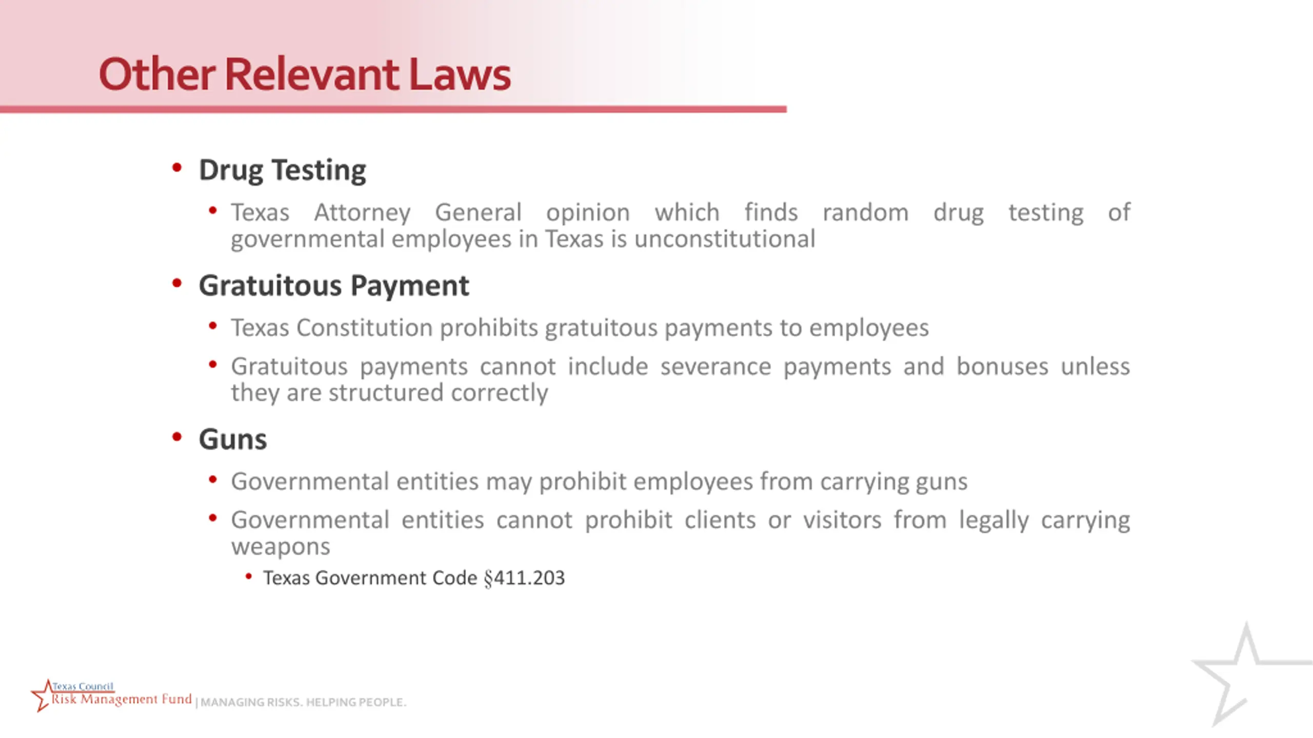 Other Relevant Laws Drug Testing Texas Attorney General opinion which finds random drug testing of governmental employees in Texas is unconstitutional Gratuitous Payment Texas Constitution prohibits gratuitous payments to employees Gratuitous payments cannot include severance payments and bonuses unless they are structured correctly Guns Governmental entities may prohibit employees from carrying guns Governmental entities cannot prohibit clients or visitors from legally carrying weapons Texas Government Code 411.203 | MANAGING RISKS. HELPING PEOPLE.
